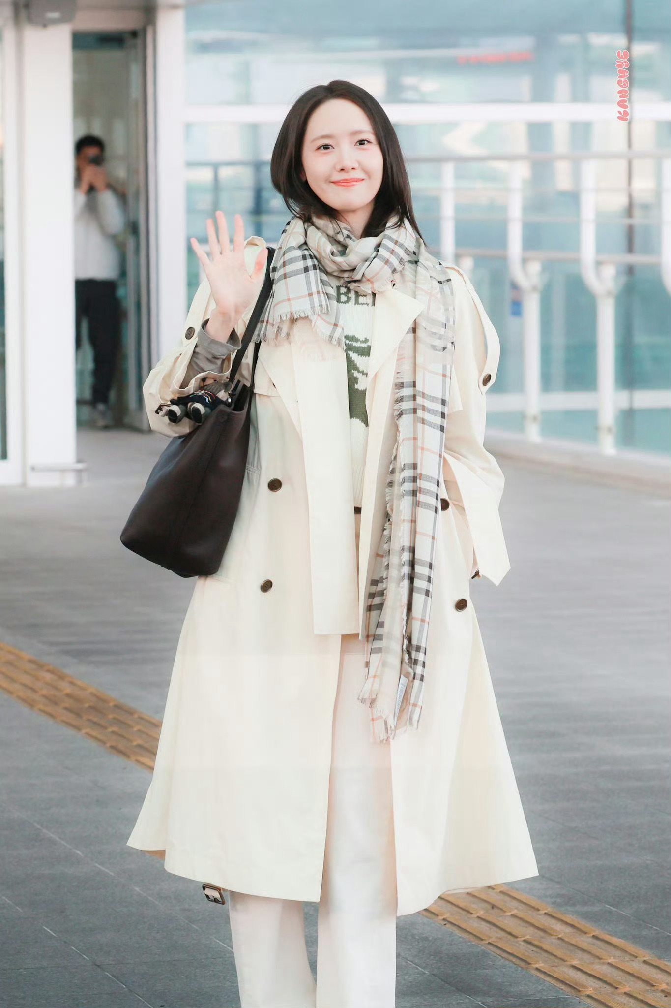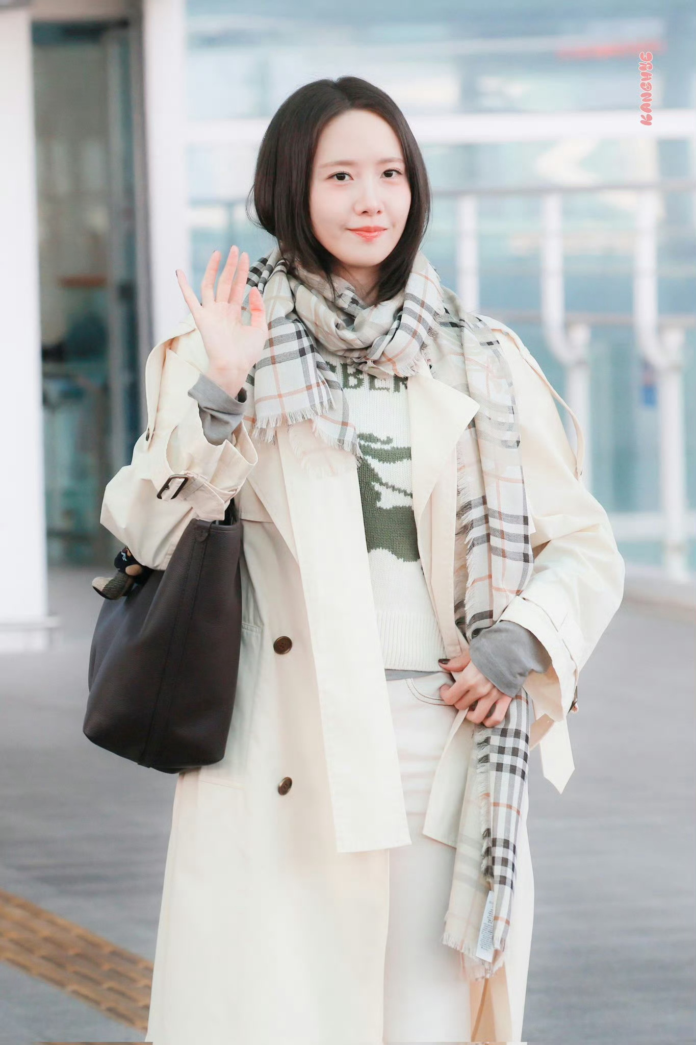林允儿身穿Burberry风衣🧥搭配浅色休闲长裤。格纹围巾。出发伦敦时装周。