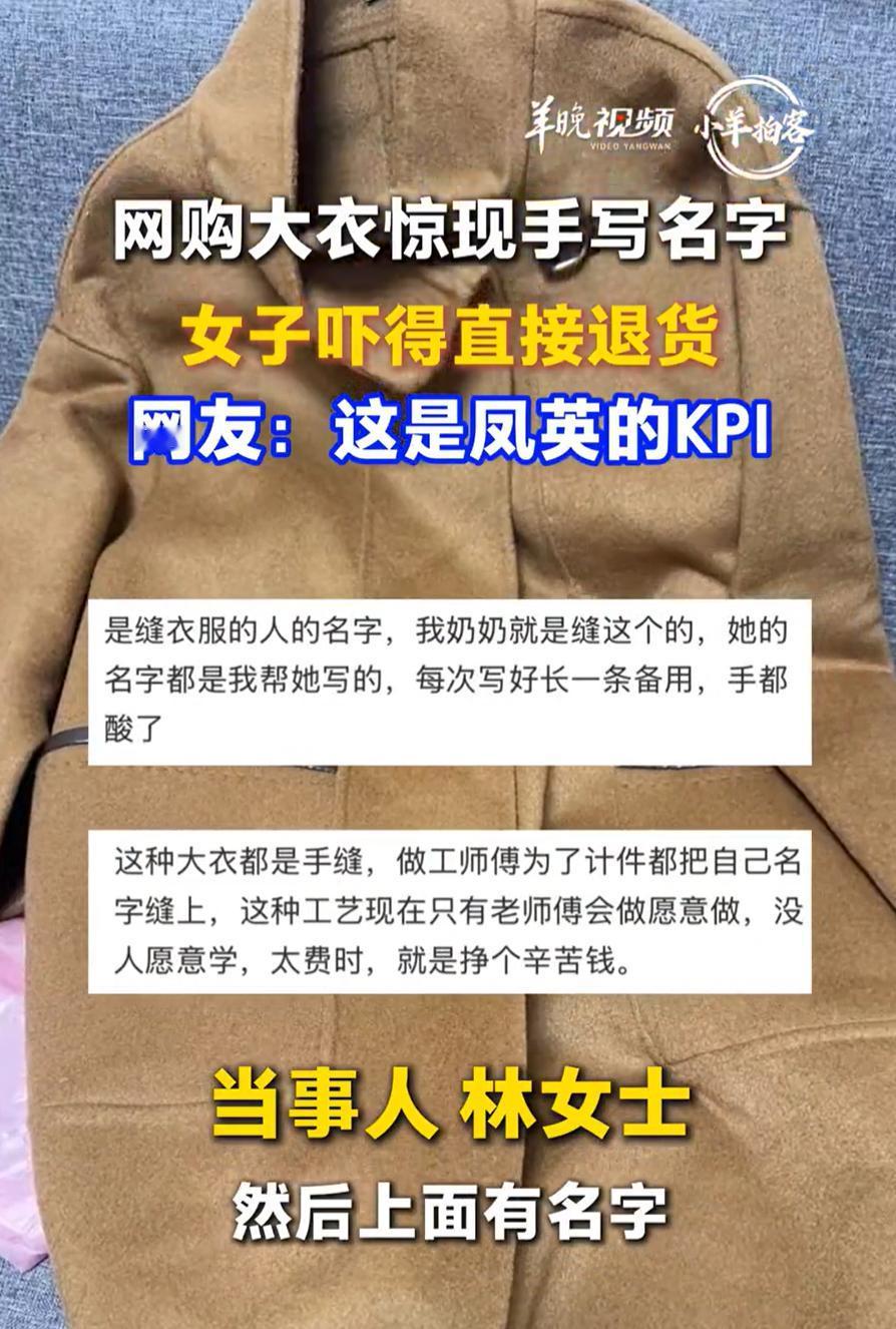 这下误会闹大了!福建龙岩,女子的母亲在直播间买了一件大衣,快递到家试穿时,就发现衣服上有一个小卡片,拿起来一看竟然是一个手写的名字,两人觉得瘆得慌,就直接退货退款了,可当她把这事发到网上,看到网友的评论却有些后悔了 当天,林女士把母亲的快递取回来后,两人就在家试穿了起来,就在林女士帮母亲整理衣服的时候,看到肩膀的位置有一个白色的小卡片,开始还以为是标签或者包装纸没摘干净,就伸手去拿 结果拿起来一看,卡片上不是商标,也不是洗涤说明,而是一个手写的人名,字迹还挺工整,像是谁用圆珠笔一笔一划写上去的 大过年买新衣服,本来是想要图个喜庆,但看到这个东西,两人却高兴不起来了,再加上颜色也不太喜欢,就直接把衣服退掉了 衣服退了之后,林女士越想越觉得这事有点意思,就把这段经历随手发到了网上,想问问大家有没有遇到过类似的情况,可网友们的评论却和她想的不太一样 很多网友一看那个卡片,直接就说,这哪里是什么奇怪的东西,这是做衣服的师傅留下的记号 有了解行情的网友解释,这种大衣很多工序是手工缝制的,尤其是那些看着就挺厚实、挺括的大衣,肩部、领口这些地方,老师傅一针一线缝下来,为了计件方便,就会把自己的名字写在卡片上缝进去。等到最后统计的时候,谁做的件数多,一眼就能认出来 还有网友补充说,这种手缝的工艺现在真的不多了,愿意学的人少,做起来也慢,赚的就是辛苦钱。能用手缝的老师傅,基本上都是干了十几二十年的老手艺人。卡片上的名字,不是什么乱七八糟的东西,是人家认认真真做活儿的凭证 这事倒是让我想起老人常说的一句话,不知者不怪,但知道了,心里就得多一份数 林女士一开始觉得瘆得慌,是因为不知道背后的原因。一旦知道了,反而觉得那张小卡片没那么碍眼了。有时候,我们觉得某样东西不对劲,是因为我们不了解它。就像很多老手艺,现在看起来好像有点跟不上时代,但仔细去了解,会发现里面有很多现代流水线代替不了的东西 网购大衣惊现手写名字 女子吓得退货