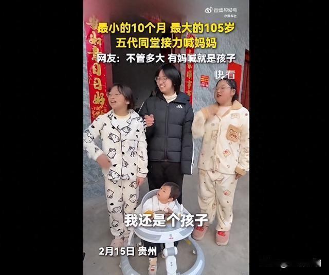 【春节团圆:有妈在,家就在,这才是这辈子最大的福气】全家平平安安 今年春节,一段视频刷爆了全网,看得无数人笑着笑着就哭了。在贵州一个普通家庭里,105岁的老母亲坐在正中间,脸上满是慈祥的笑容,五代人排着队,从才10个月大的小宝宝,到80多岁的白发老人,一个个上前,轻轻喊一声“妈妈”。没有华丽的布置,没有刻意的表演,就是最朴素的一声声呼唤,却戳中了亿万人心里最软的地方。 这一幕火了之后,网上到处都是效仿的一家人。有的家里,最年长的妈妈拿着个洗脸盆,当起了“领头司机”,后面子子孙孙排成长龙,又唱又跳,热热闹闹围着老母亲转。屋里全是笑声,幸福都快溢出来了,不管日子过得怎么样,只要有老母亲在,一家人凑在一起,就是最踏实的幸福。 很多人看完都感慨:有妈就有家,有妈的日子,真的太幸福了。不管你多大年纪,是满头白发,还是已经当了爷爷奶奶,只要妈妈还在,你就永远是个孩子。受了委屈可以跟妈说,累了可以回家靠一靠,过年过节一进门,能喊一声妈,有人应,这就是天大的福气。 可这份福气,不是每个人都能拥有。有人说,看着别人一家人围着老母亲笑,自己却忍不住掉眼泪,因为自己的爸妈已经不在了。以前总觉得日子还长,总忙着赚钱、忙着打拼,忽略了陪在父母身边。等到再也喊不应那声“妈”,才明白,一家人热热闹闹吃顿团圆饭,是这辈子再也回不去的时光。那些曾经觉得平常的唠叨、叮嘱,现在想起来,全是最珍贵的回忆。 我们总在追财富、追名利,觉得有钱有势才是成功,可真到了过年团圆的时候才懂,再多的钱,买不来父母健在;再大的名气,换不回一家人围坐的温暖。生活里的难、工作里的累,在家人的陪伴面前,都不算什么。只要父母安康,家人平安,一家人能常聚在一起,说说笑笑,就是这辈子最值得的事。 父母在,人生尚有来处;父母去,人生只剩归途。别等到失去了才懂得珍惜,别让陪伴变成遗憾。趁着父母还在,多回家看看,多喊几声爸妈,多陪他们吃顿饭、聊聊天。 这个春节,愿我们都能珍惜这份血脉相连的缘分,珍惜有妈在的日子。一家人整整齐齐,平平安安,比什么都重要。有妈,有家,有爱,就是这一生最好的光景。