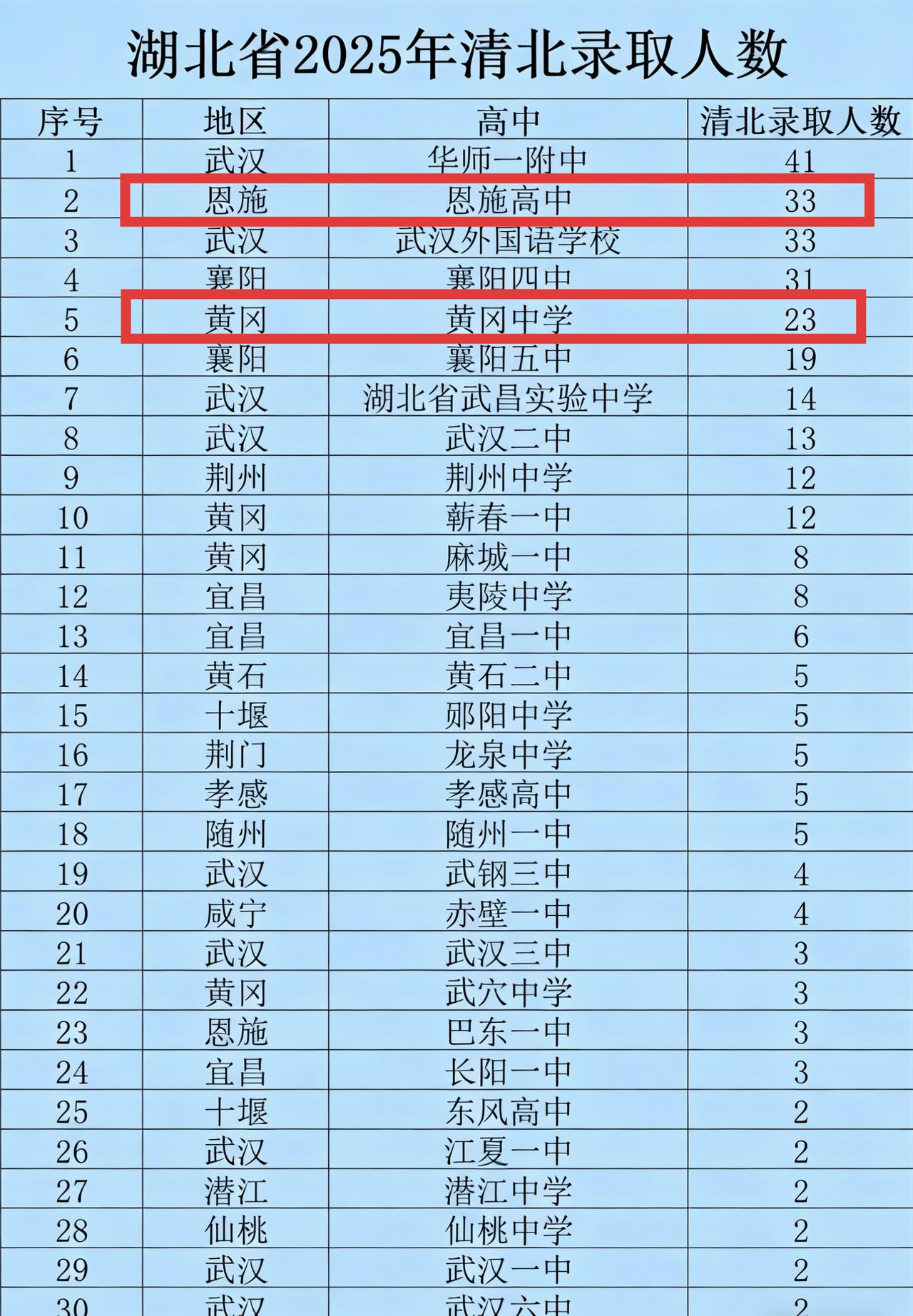 2025湖北考上清北人数最多的中学,恩施高中这么厉害的吗,居然有33人排名全省第二。作为外省人,唯一知道的就是黄冈中学,以前读高中就经常刷它们的试卷,还买了黄冈兵法教辅书,如此大名鼎鼎的黄冈中学,清北人数好像一般啊。