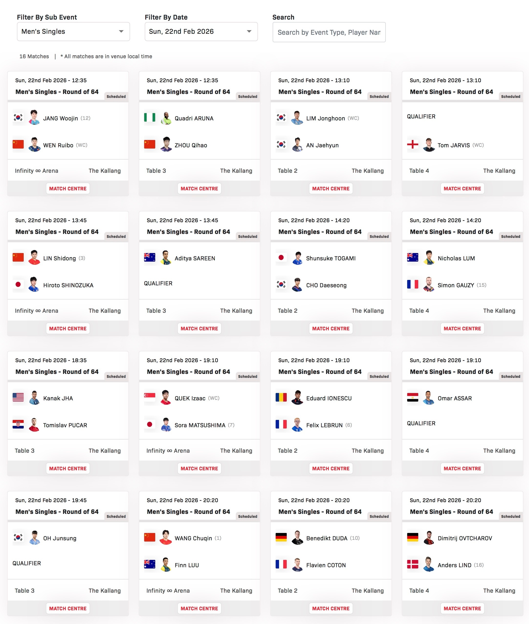 WTT新加坡大满贯2026 中国队2月22日赛程12:35 温瑞博🇨🇳vs张禹珍🇰🇷 T112:35 周启豪🇨🇳vs阿鲁纳🇳🇬 T313:45 林诗栋🇨🇳vs篠塚大登🇯🇵 T113:45 覃予萱🇨🇳vs桥本帆乃香🇯🇵 T214:20 王曼昱🇨🇳vs曾尖🇸🇬 T114:20 陈幸同🇨🇳vs待定 T319:45 陈熠🇨🇳vs波尔卡诺娃🇦🇹 T120:20 王楚钦🇨🇳vs卢伟🇦🇺 T1