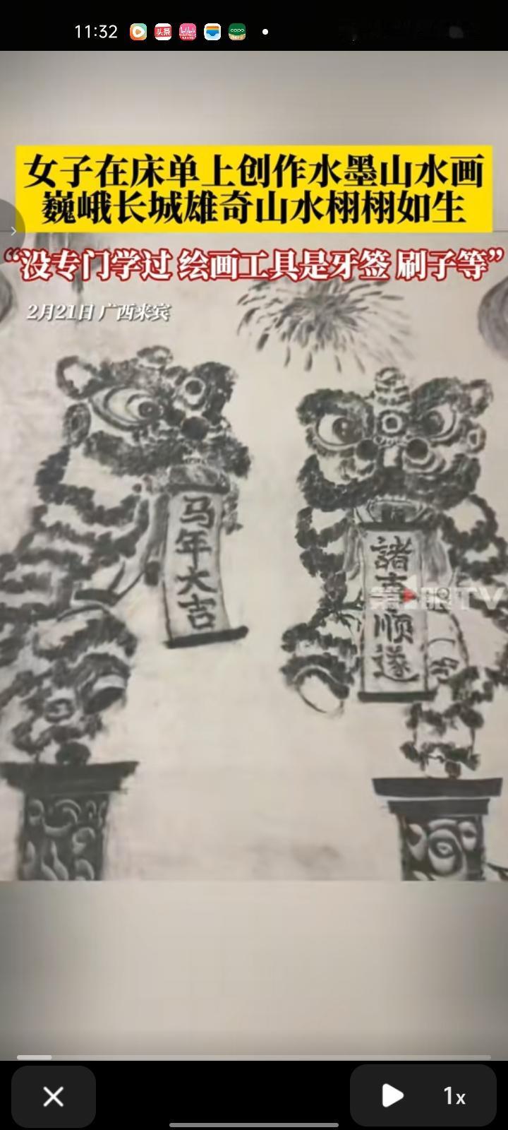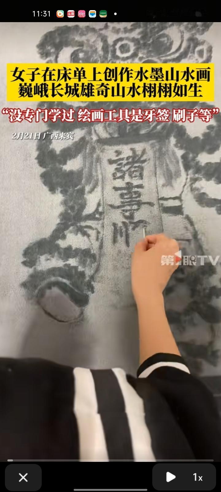 2月21日,广西来宾。女子在床单上创作水墨山水画,巍峨长城雄奇山水栩栩如生。 当事人谢女士称,床单从左到右和从右到左呈现的效果不一样,手的力度呈现出的效果有深有浅,当时就想着能不能用它做一幅画。绘画工具是家里常用的牙签、刷子等,没学过画画,小时候对画画感兴趣 喜欢各种乱涂乱画