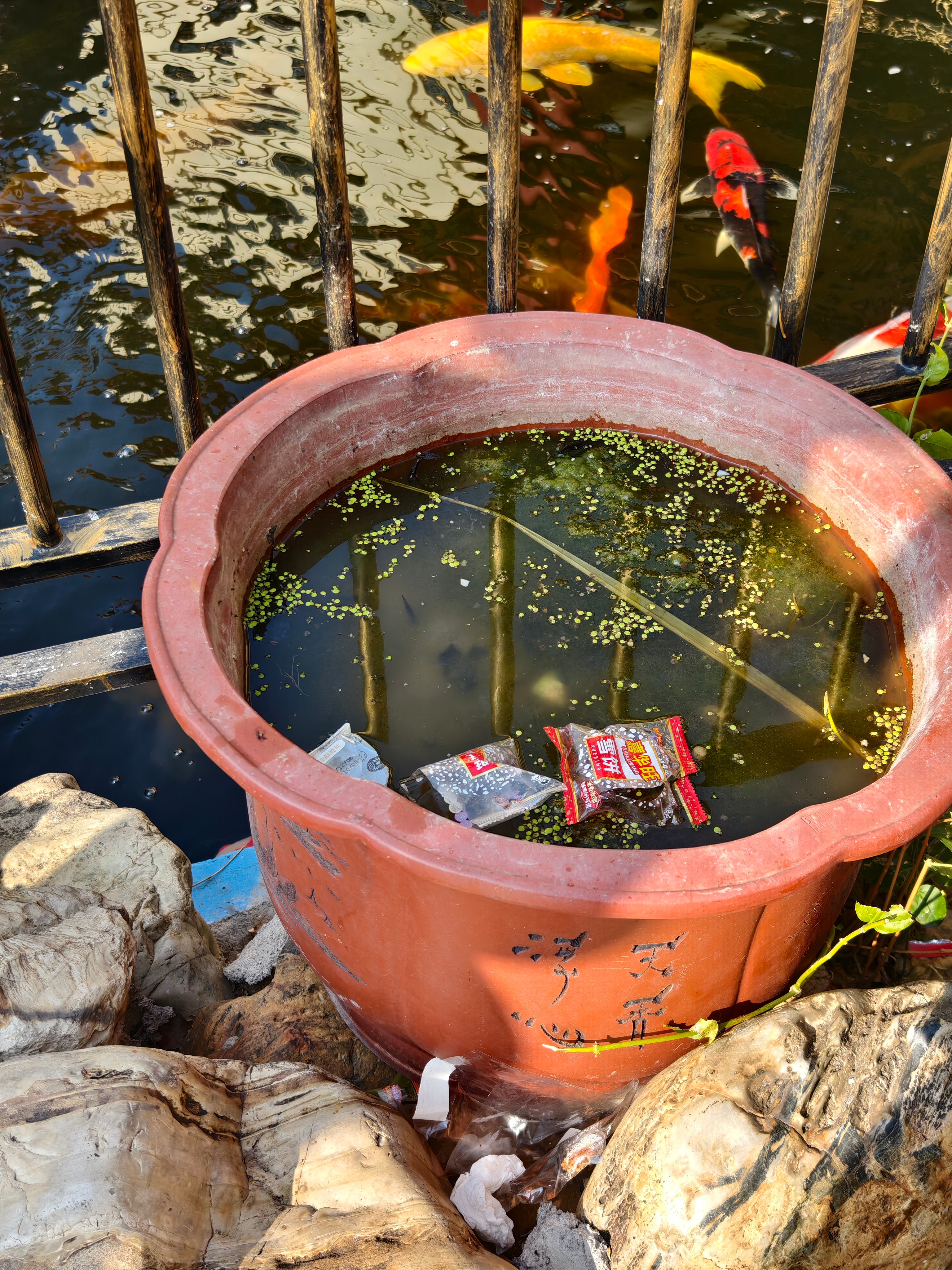 寺庙地方乱扔垃圾还在锦鲤池旁边