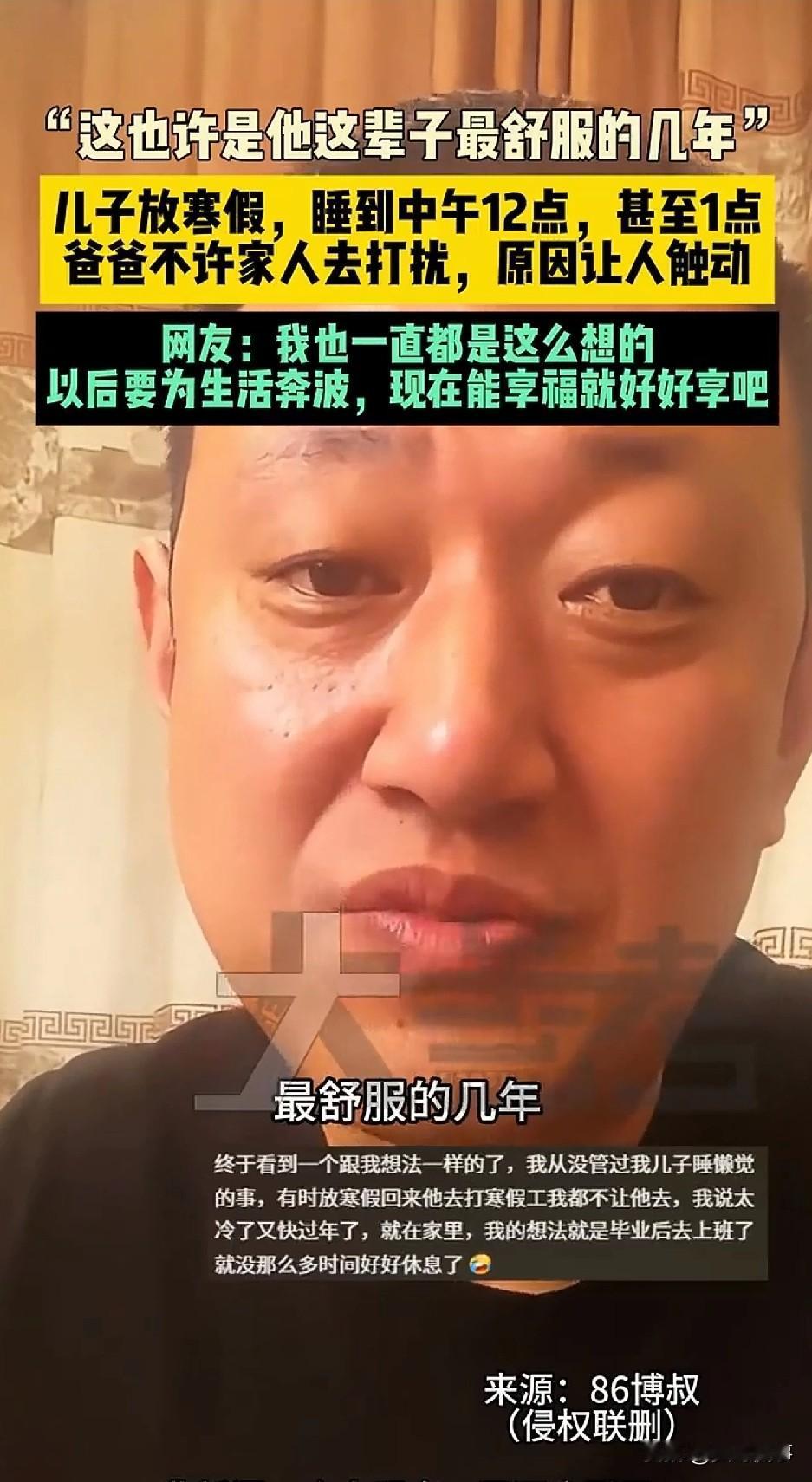 “这位父亲的做法太明智了!”最近,河北一位爸爸的“佛系待娃”日常,刷爆了全网。没有鸡飞狗跳的起床拉锯,没有苦口婆心的作息说教,只有一句戳中千万人的心里话:这也许是他这辈子最舒服的几年了!。 根据这位爸爸的描述,孩子是一名正在读书的学生。 在河北这样的教育环境里,孩子平时的辛苦,当过父母的肯定都懂。天还没亮就要起床出门,白天在学校连轴转,晚上回家还有写不完的作业、背不完的书,一天下来,能睡够的时间少得可怜。 长期紧绷的学习节奏,让孩子连好好睡一觉,都成了一种奢侈。 好不容易盼到寒假,孩子能放松下来睡“懒”觉了,可父母在早上却一遍遍地敲门喊孩子起床,念叨他们作息不规律,甚至直接批评孩子懒散、不上进。 然而,在这个家里,画风则完全不一样。 据这位爸爸表示,儿子放寒假后,每天都能一觉睡到中午12点,有时候甚至能睡到下午一点。 但他们从来不去打扰,早饭、午饭都做好,儿子啥时候起来啥时候吃。 在这位爸爸看来,儿子现在还在上学,不用赚钱养家,也不用面对社会的压力、不用承担家庭的责任,更不用处理复杂的人情世故。 这段不用扛事、不用焦虑、能安心睡到大中午的时光,也许就是他这辈子最舒服、最没有负担的几年了。 他还说:“等孩子将来考上大学、步入社会、工作成家,要为生活奔波,为前途发愁,到时候别说睡懒觉,能睡个安稳觉都很难。现在能让他多放松一天,就多放松一天,我为什么非要叫醒他呢?” 这段朴素的话语,迅速引发了全网共鸣,评论区也分成了两种观点。 支持的网友表示,这才是最懂孩子的父母,要知道,假期的意义就是休息,比起所谓的自律,孩子的身心健康更为重要。 很多成年人更是感同身受,长大后才发现,学生时代无忧无虑的时光,再也回不去了。 当然,也有网友提出担忧,认为长期作息颠倒会伤害身体,开学后也难以调整状态,适度放松可以,但完全放纵并非好事。 显然,在他们看来,好习惯需要从小坚持,过度纵容反而不利于孩子成长。 其实,大家争论的从不是“几点起床”,而是不同的家庭对爱与教育的不同理解! 很多父母习惯把自律和早起绑定,把放松和懒散挂钩,在焦虑中不断催促孩子,却忽略了他们长期紧绷的疲惫。 而这位爸爸的可贵之处,在于他不焦虑、不控制,用不打扰的温柔,给了孩子最踏实的安全感。 是啊,孩子成长不应是一刻不停的奔跑,真正的教育,也不是时刻严苛的管教。 回到家,该是孩子累了可以休息、倦了可以停靠的港湾,允许孩子偶尔“躺平”,这不是溺爱,而是最深沉的理解和体谅。 这件事也再次让我们思考:在教育孩子的路上,我们究竟是要逼他时刻优秀,还是先守护他的快乐与健康呢? 最后也想问问大家,如果是你,孩子放假天天睡到中午,你会选择叫醒他,还是像这位爸爸一样,让他睡到自然醒?你觉得,这是温柔的爱,还是过度的纵容? 欢迎大家在评论区留言。
