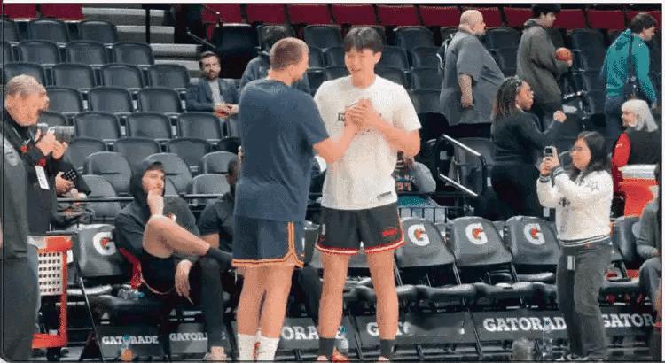 杨瀚森美梦成真啊! 今天,开拓者队坐镇主场迎战掘金队,杨瀚森迎来与偶像约基奇碰面的机会。在热身训练期间,杨瀚森抓住机会与约基奇在场边沟通交流,两人有说有笑,聊得十分融洽,这对于杨瀚森来说是圆梦时刻,相信交流内容会让他受益匪浅。期待两人在球场上的正面对决。