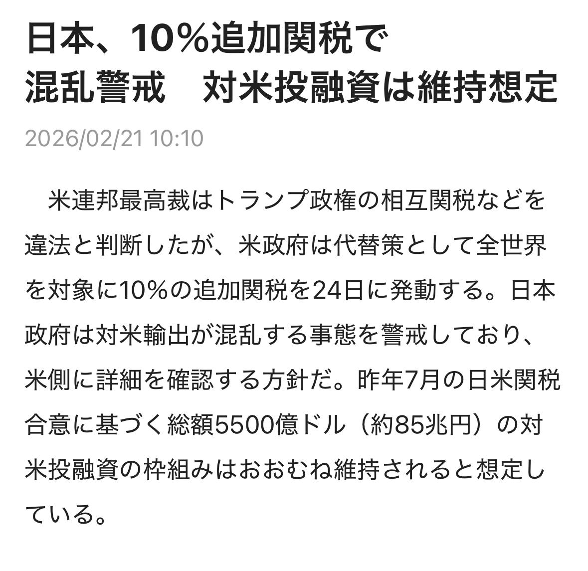 美国联邦最高法院裁定特朗普政府的互惠关税违法,但美国政府计划于24日启动针对全球的10%额外关税作为替代方案。日本政府担忧对美出口将陷入混乱,正计划向美方确认详细情况。基于去年7月日美关税协议,总额5500亿美元(约85万亿日元)的对美投资框架预计将基本维持。 此前针对日本的互惠关税规定,原税率低于15%的商品将上调至15%,高于15%的则维持原状。随着这些措施被撤销,新的10%关税将叠加征收。日本政府计划向美方交涉,以确保不会出现比日美协议下的现行税率负担更重的商品。 据美国政府表示,汽车及零部件、钢铁等特定领域的关税将不纳入此次额外关税的征收范围。日本汽车关税预计将维持在15%。日本经济产业大臣赤泽亮正曾于今年1月预测,即使互惠关税被裁定违法,美国政府也会寻找《国际紧急经济权力法》以外的依据来继续征收关税。 —美国联邦法院这是和特朗普唱双簧啊,日韩等国家和地区和美国特朗普谈了半天交了保护费还是不行啊。