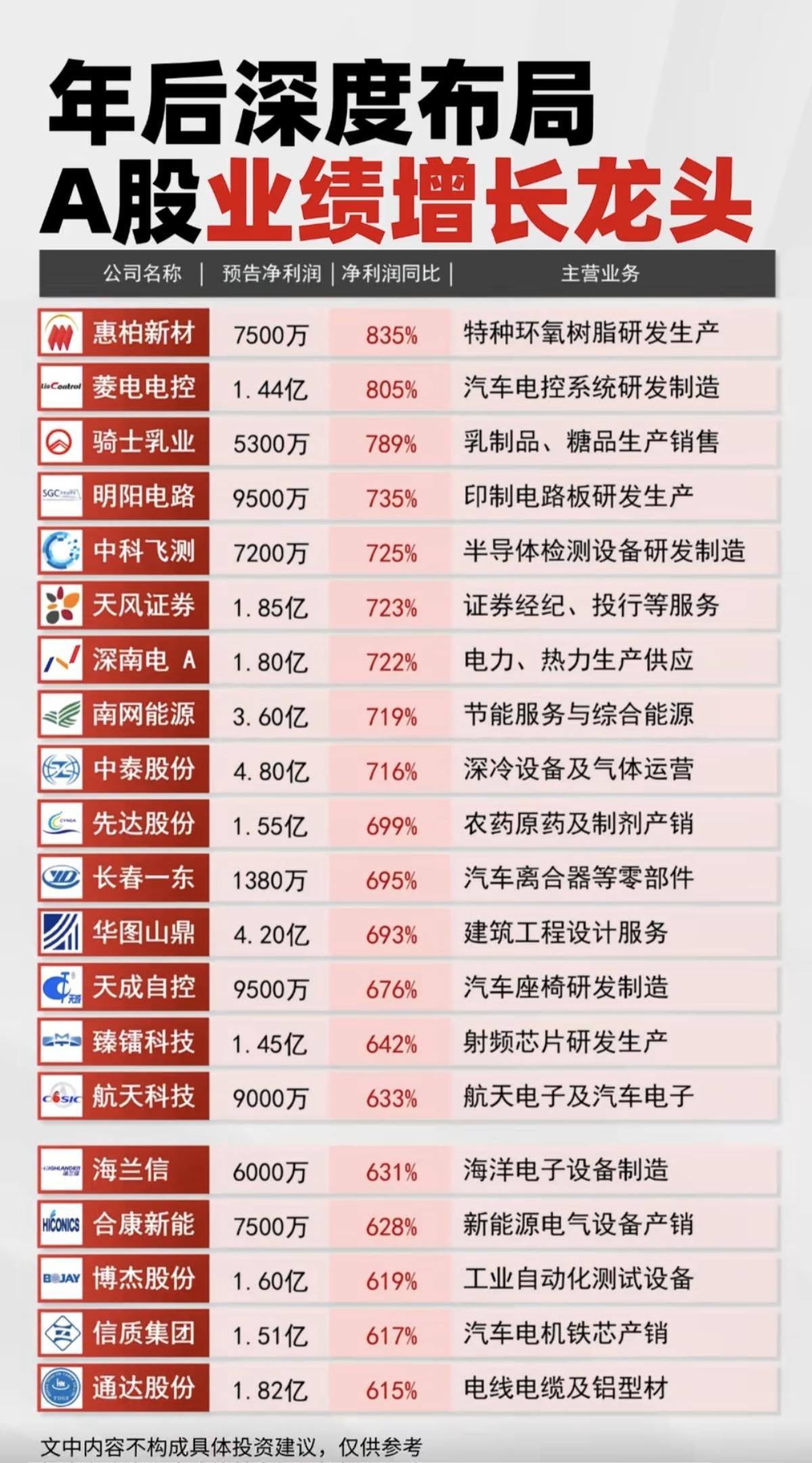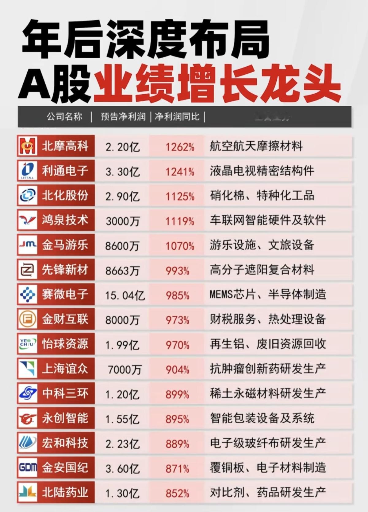 深度布局:A股业绩高增长龙头股! 50家公司业绩高增长,最高增长4379%,最低增长615%。 业绩+题材,才是王道! 相关核心龙头股名单: