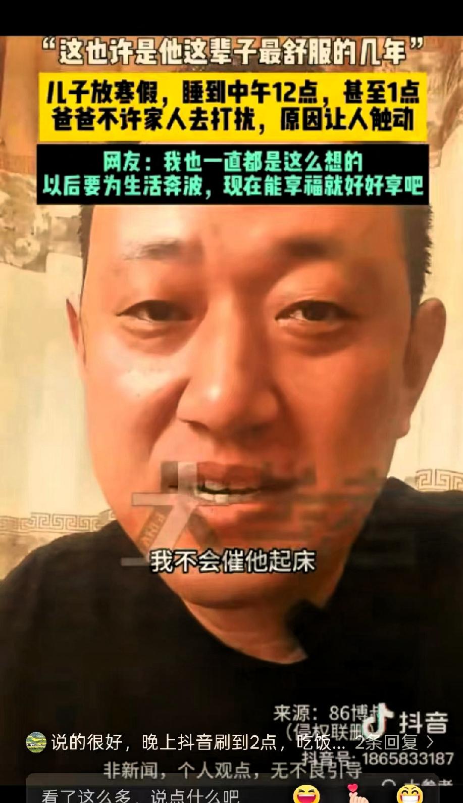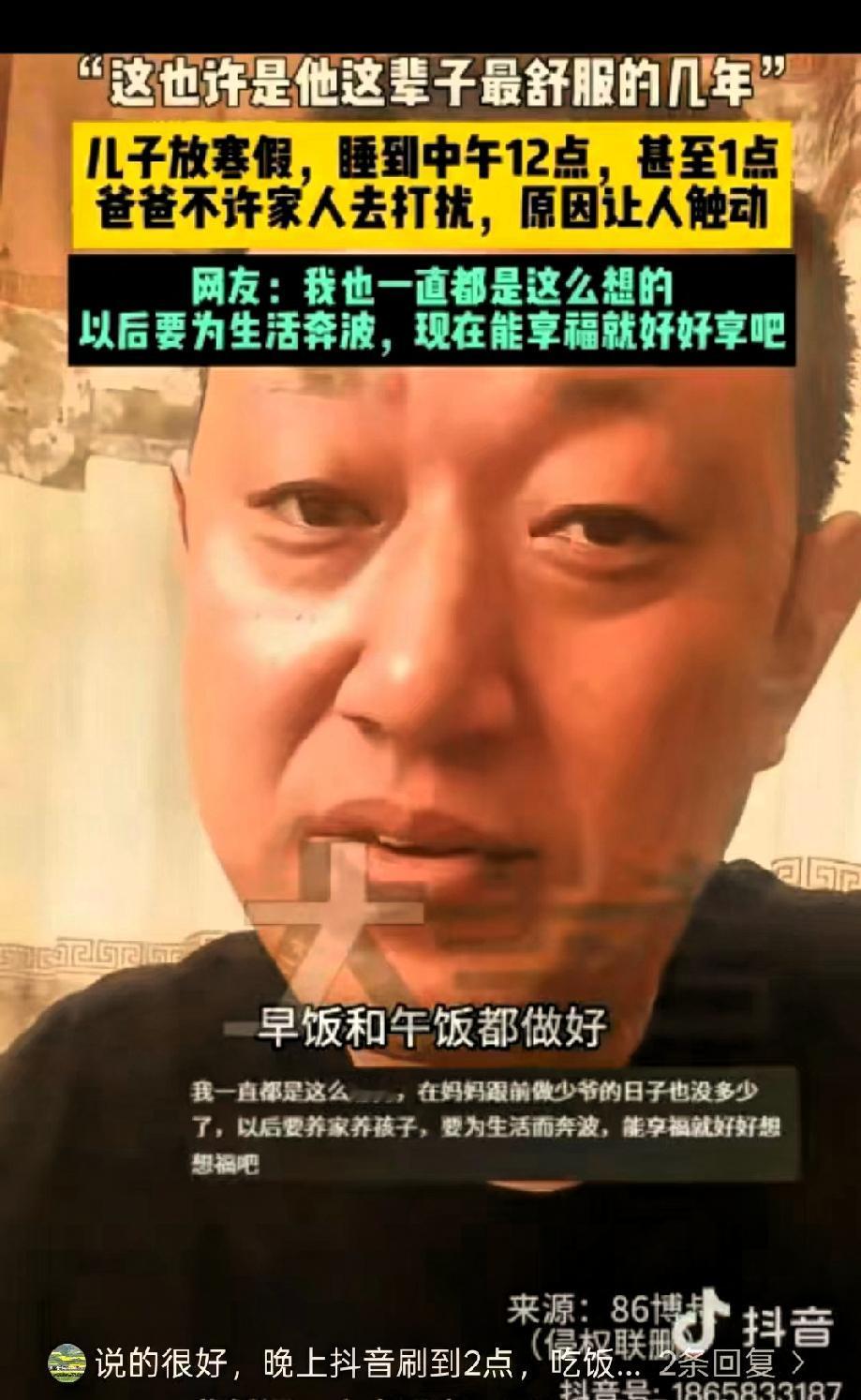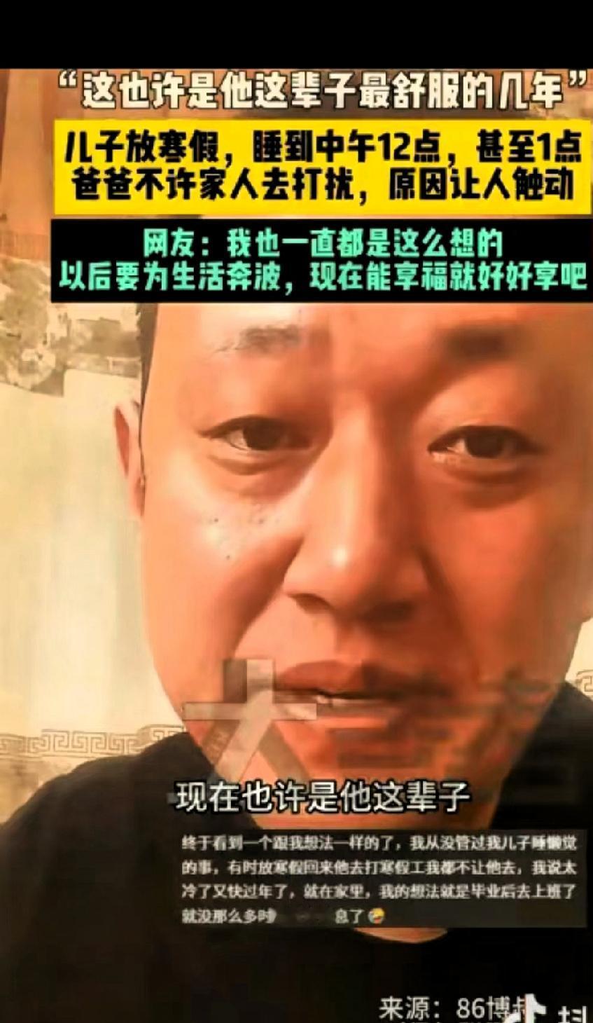 这位父亲真的清醒!河北,一位父亲发视频称,自己的儿子放寒假回家,每天都要睡到中午甚至是下午,这位父亲从不刻意叫醒,也不反复唠叨,只是把饭菜准备好,让孩子自然醒来。 在不少人看来,这种做法有些纵容,甚至担心孩子养成懒散的习惯,可这位父亲的想法,却显得格外理性。 他认为,学生时代没有生活压力,不必为生计奔波,也不用承担家庭责任,这段可以安心休息的时光,其实非常珍贵。等孩子真正步入社会,需要独自面对工作与生活的压力时,想拥有这样毫无顾虑的睡眠,会变得很难。家长不必在孩子最轻松的阶段,过度强调自律和紧张。 现在很多家庭对孩子的作息、学习都安排得十分紧凑,生怕孩子放松就会落后。适当的督促固然重要,但假期的意义,本就是让孩子调整状态、舒缓情绪。家的作用,是给孩子安全感和归属感,而不是时刻保持紧绷的节奏。短暂的休息,不等于长期的懈怠,更不等于未来没有担当。 孩子的责任感,不是靠催促和约束逼出来的,而是在理解与尊重中慢慢形成的。未来生活自然会让他学会承担,父母不必提前用严苛的方式,让孩子过早感受疲惫。一个在家能被包容的孩子,内心会更稳定,也更有勇气面对今后的挑战。 真正有远见的教育,不是把孩子的每一分钟都填满,而是在合适的阶段,给予合适的宽容。不把放松当成错误,不把休息当成荒废,这不是溺爱,而是一种清醒的教育方式。