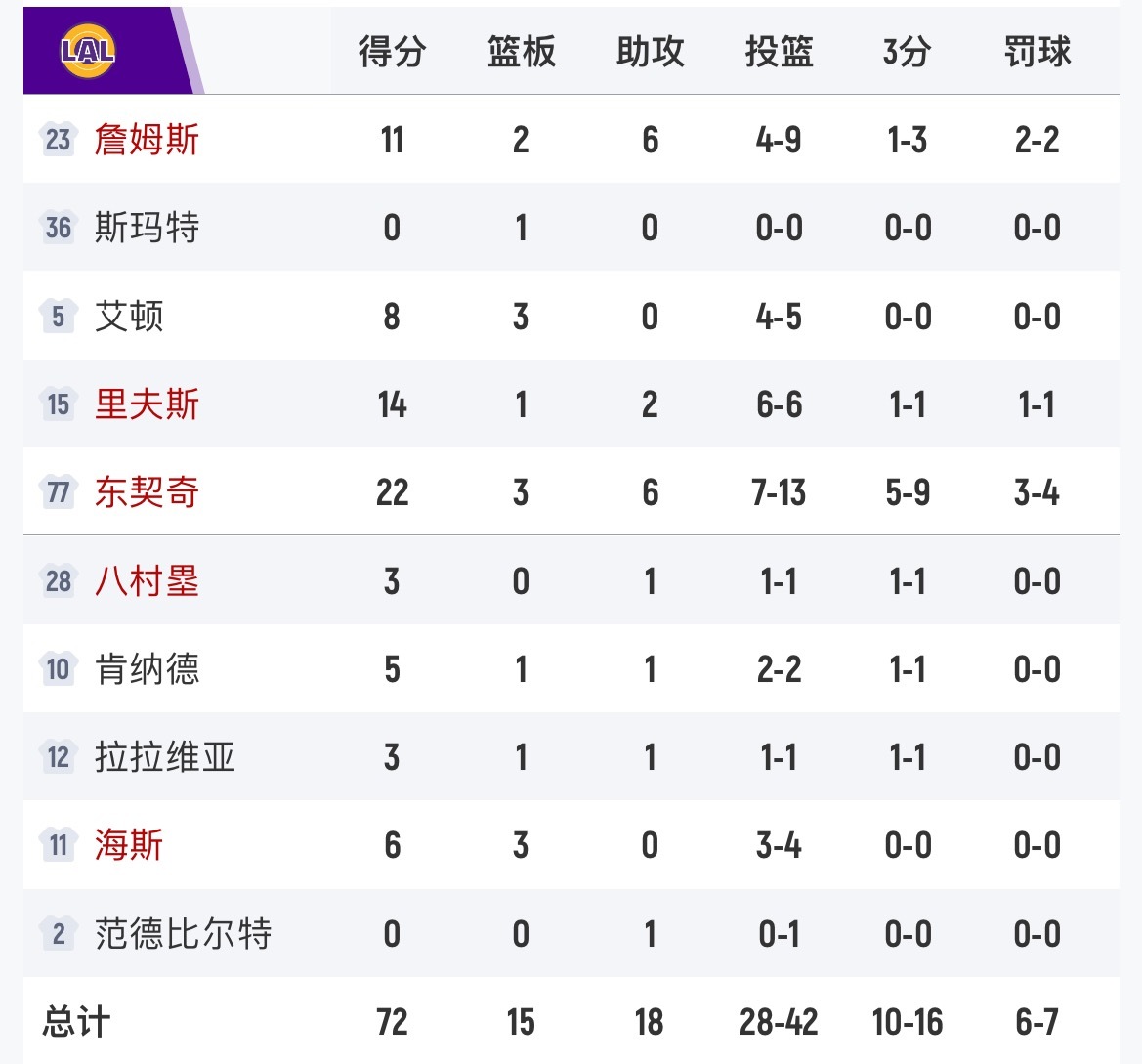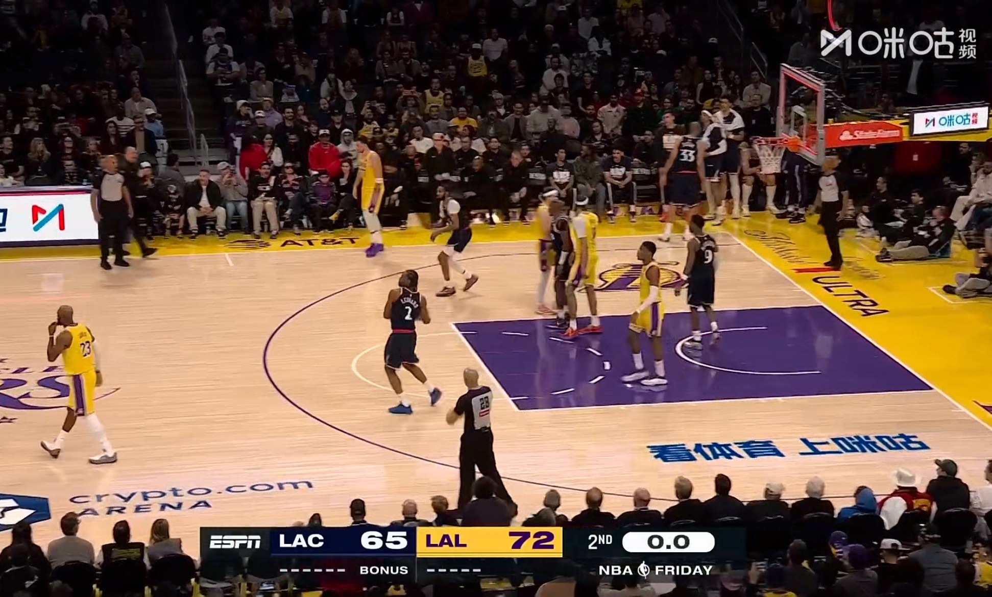 半场比赛结束,湖人72-65快船。