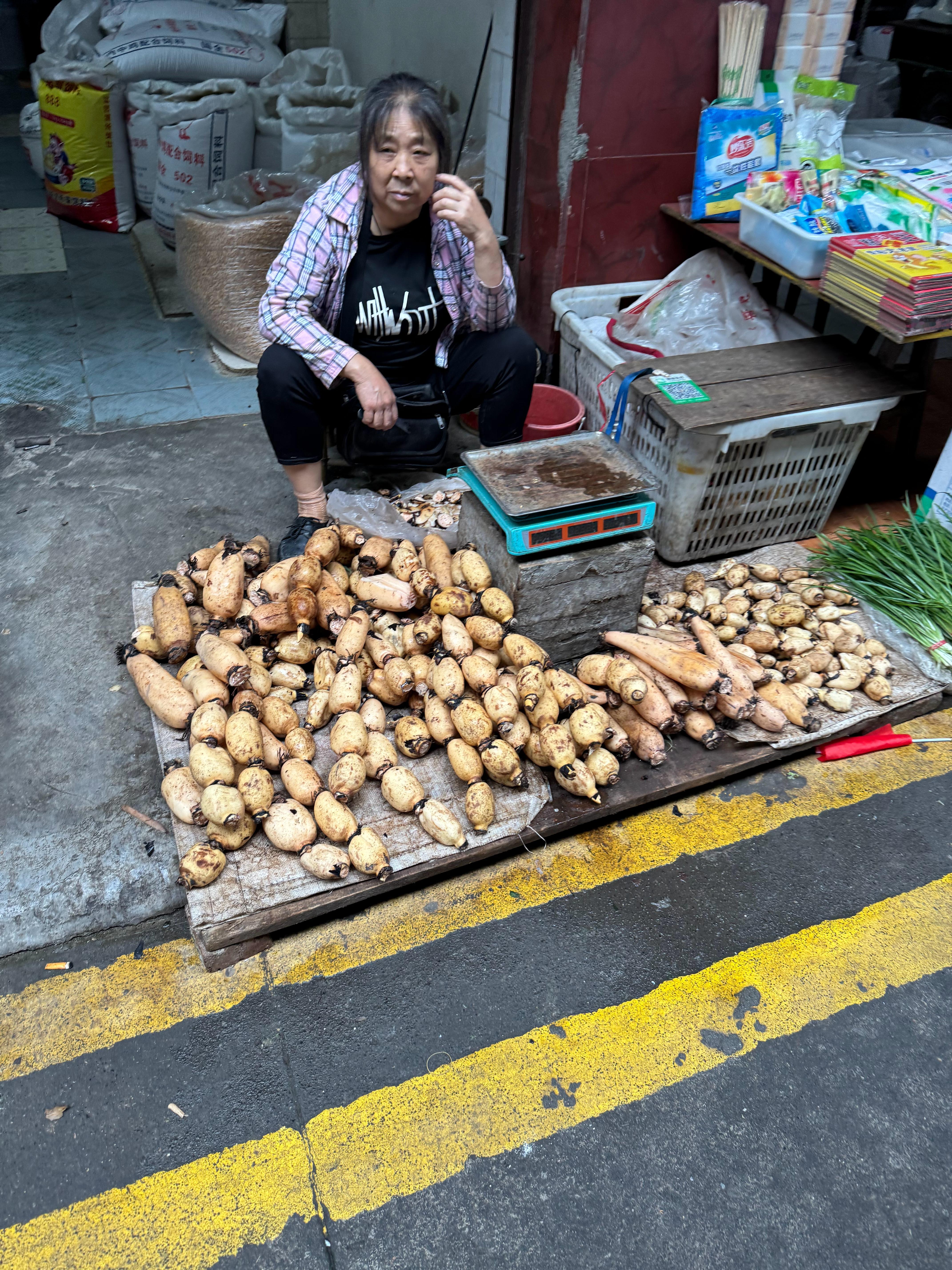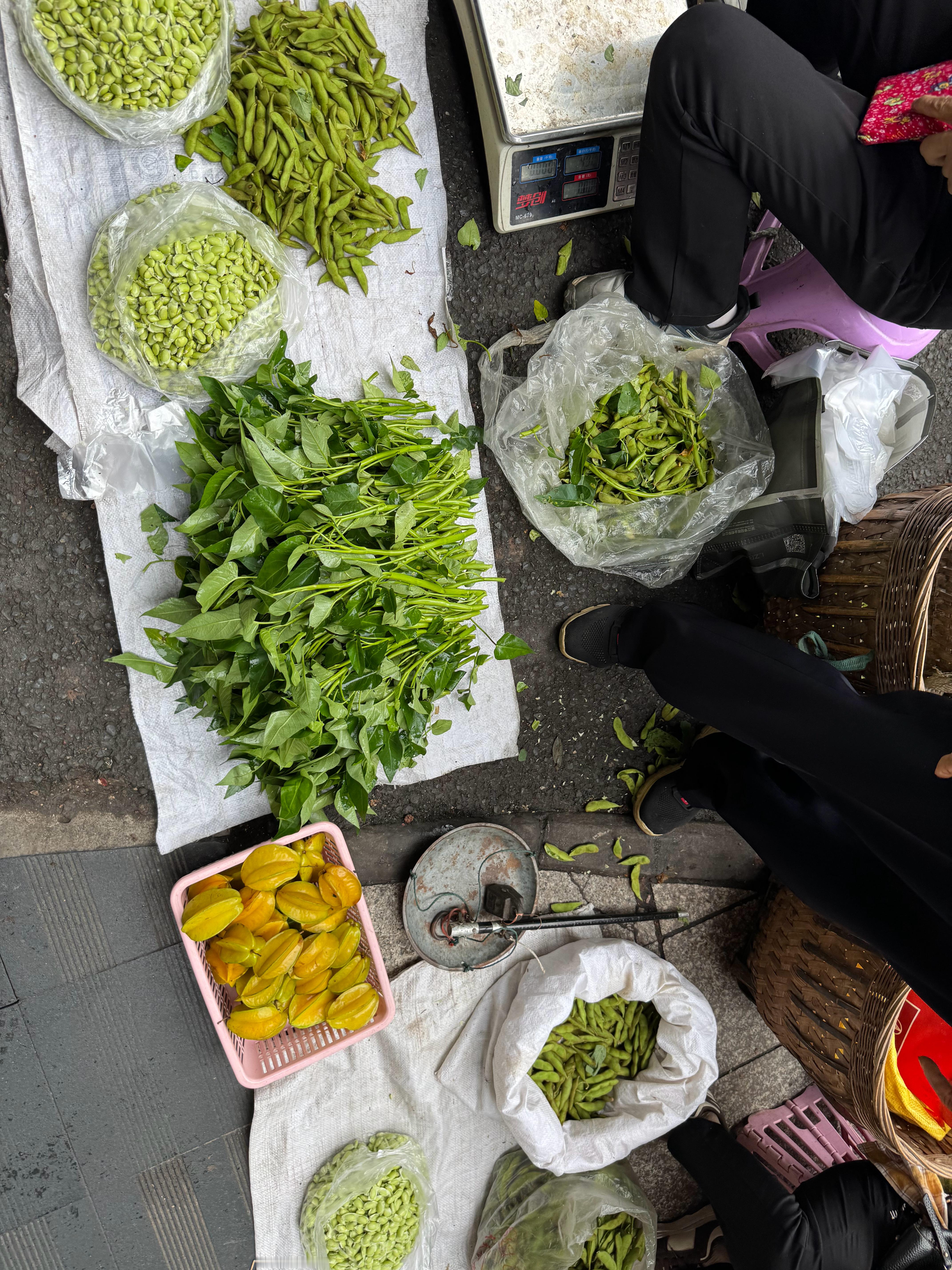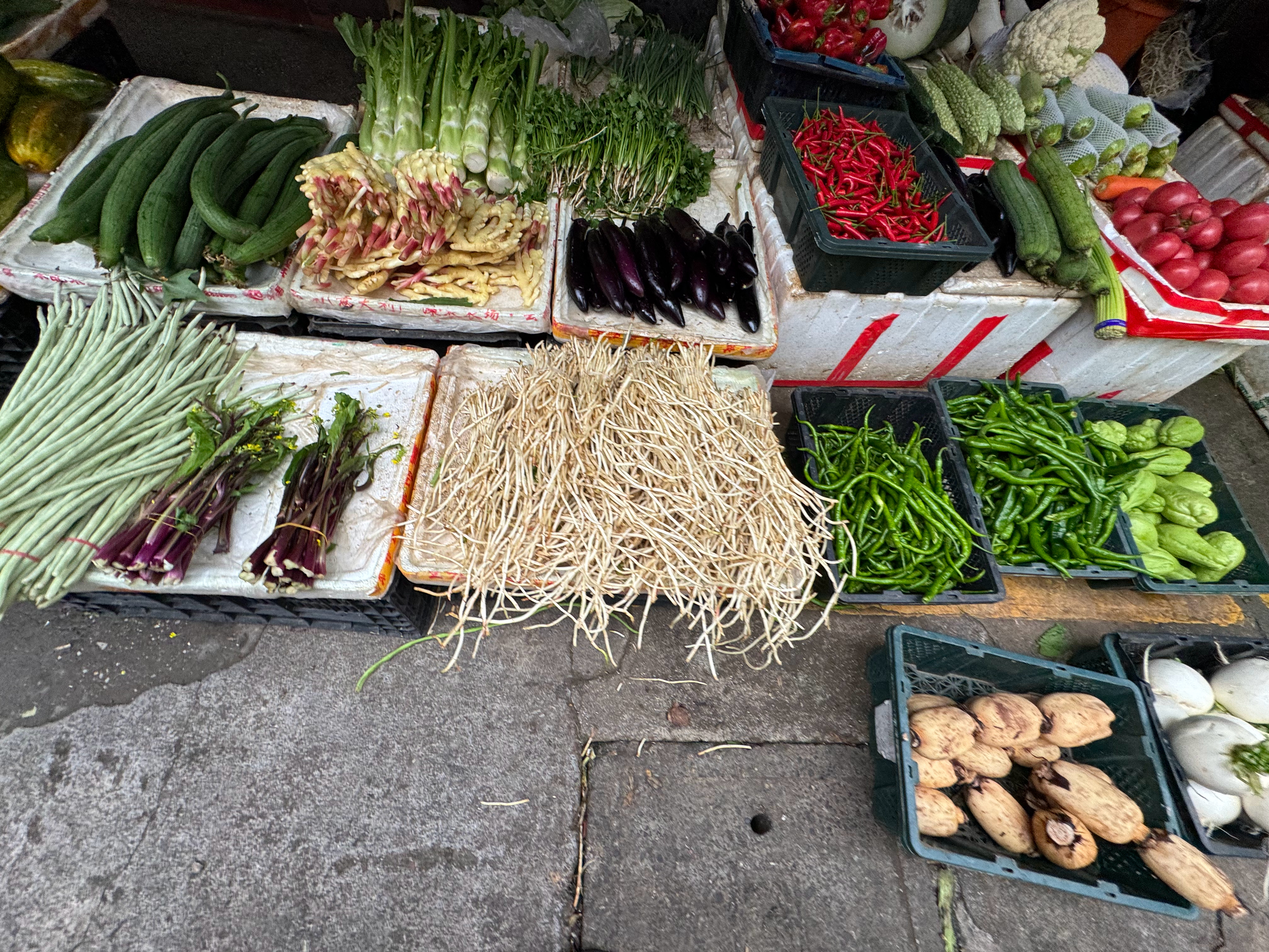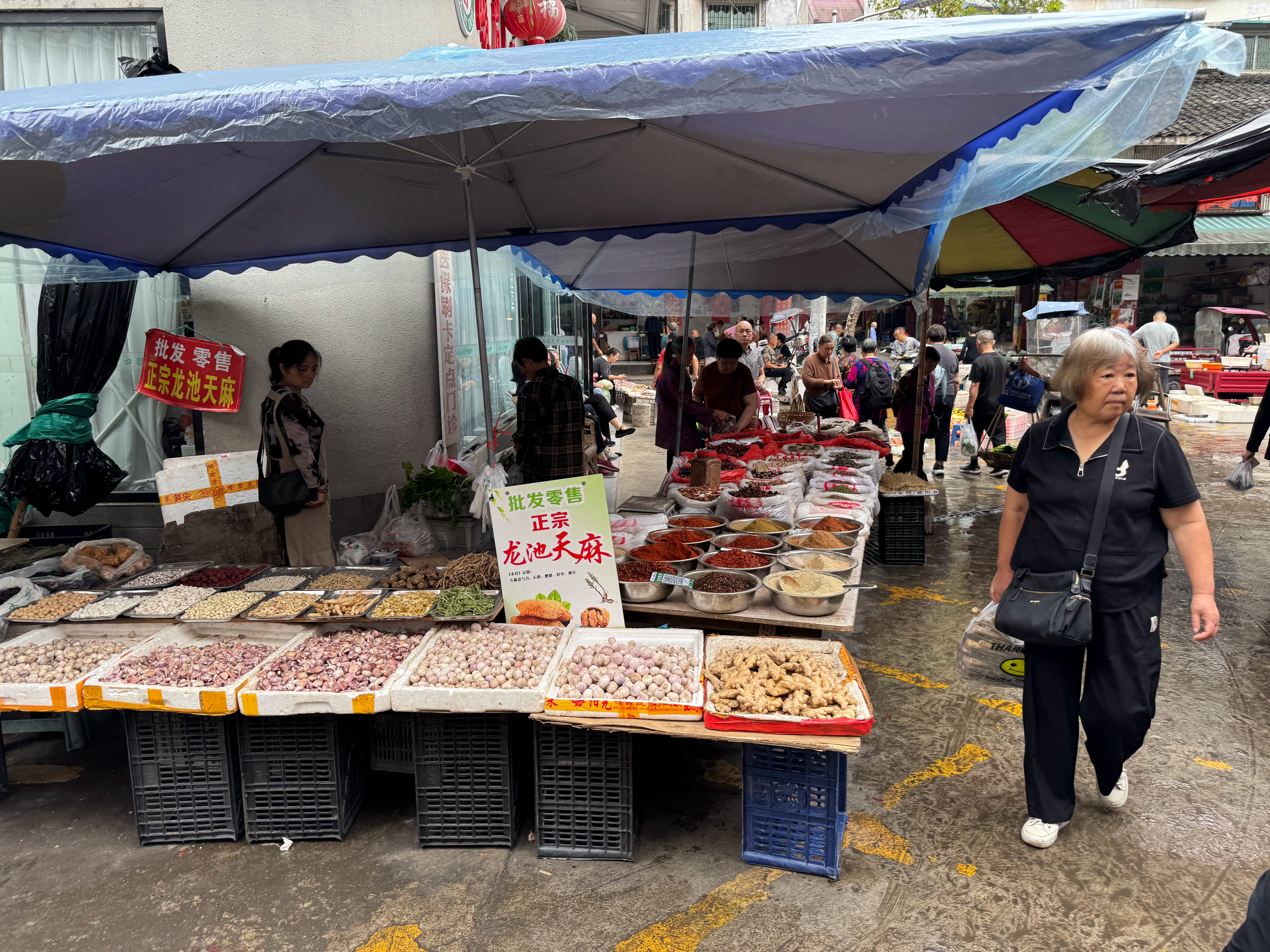 市场周围的小路上,挤满了农贩。他们没有铺子,一个背篓,一块塑料垫,一杆秤,就能开始做生意。带来的东西也不多,几堆水果,几把蔬菜,大多是自家种的。可能一天卖不了多少钱,但这点收入对他们来说已经足够。很多老人甚至没有手机,不能移动支付。我买菜的时候才发现这个问题,本以为只能作罢,结果旁边的商铺很自然地帮忙做了中转——我扫码给商铺,商铺把现金递给老人。老人不停说麻烦了,店主只是摆摆手,好像这种事每天都在发生。