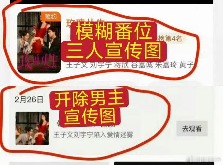 玫瑰丛生站内预约海报带了特出高伟光,而且男主有时候还没显示,现在刘宇宁家要求更换成两人海报只放男女主
