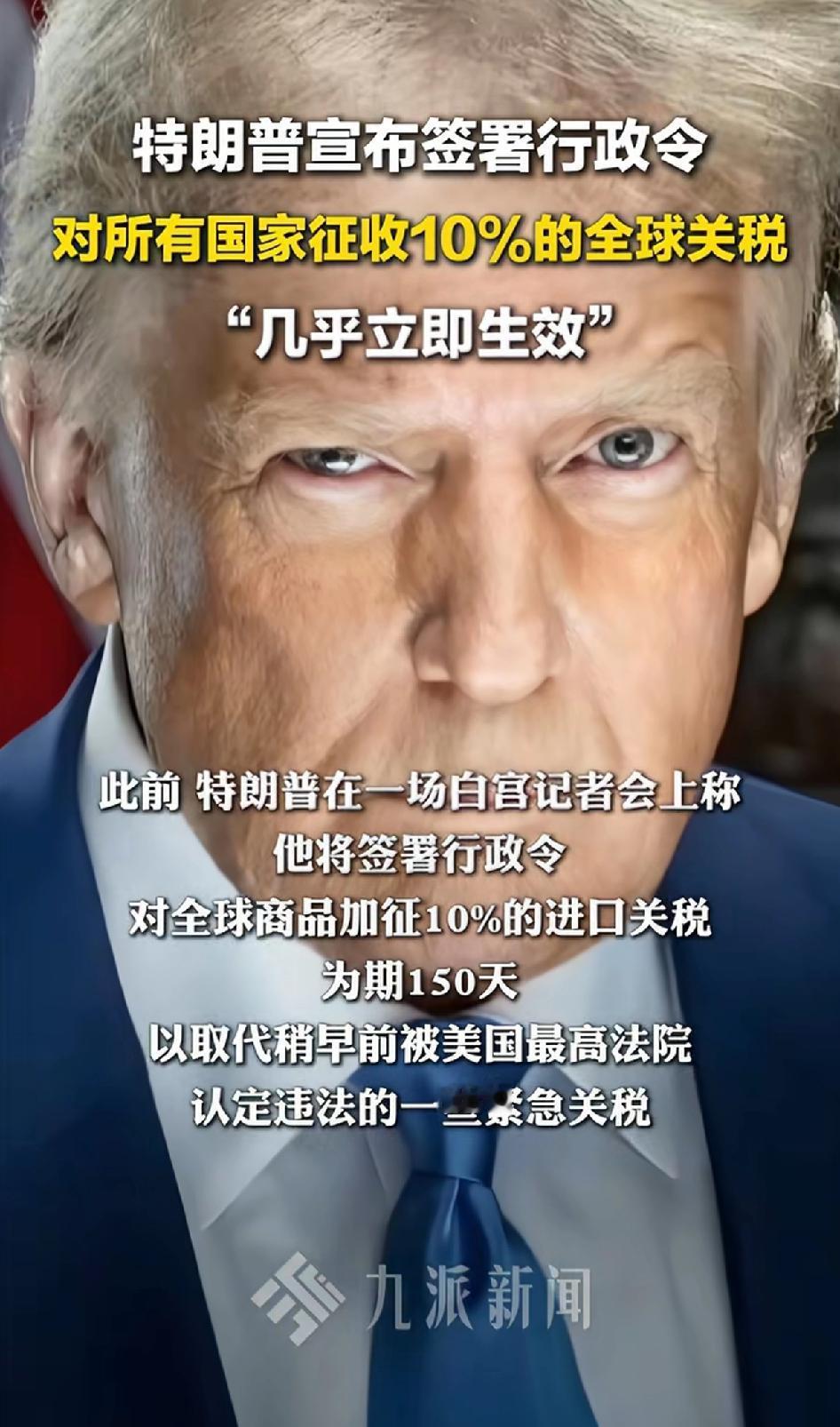 特朗普宣布签署行政令,对所有国家征收10%的全球关税,“几乎立即生效”。 特朗普又搞大动作了!当地时间2月20日,他宣布要签署行政令,对全球商品加征10%的进口关税,为期150天,来取代被最高法院认定违法的紧急关税。 这新关税依据《1974年贸易法》第122条,最多持续150天,除非国会批准延期。 之前基于《国际紧急经济权力法》征收的关税被判违法,当被问约1750亿美元关税收入退不退时,特朗普称最高法院裁决有缺陷,还猜这事得打几年官司。 此外,他还说要启动“不公平贸易行为”调查,那些以“国家安全”为由的关税也继续有效。这波操作,又得让全球贸易市场“抖三抖”了。 一边跟全世界打贸易战,一边又侵略别的国家。特朗普做了美国总统后太想做出成绩了。手上有权立马就要全部使出来,权力最大化,使劲过瘾,真怕下台后没得使。今天骂这个明天打那个,要受到万众瞩目,全世界所有目光都要看向他。