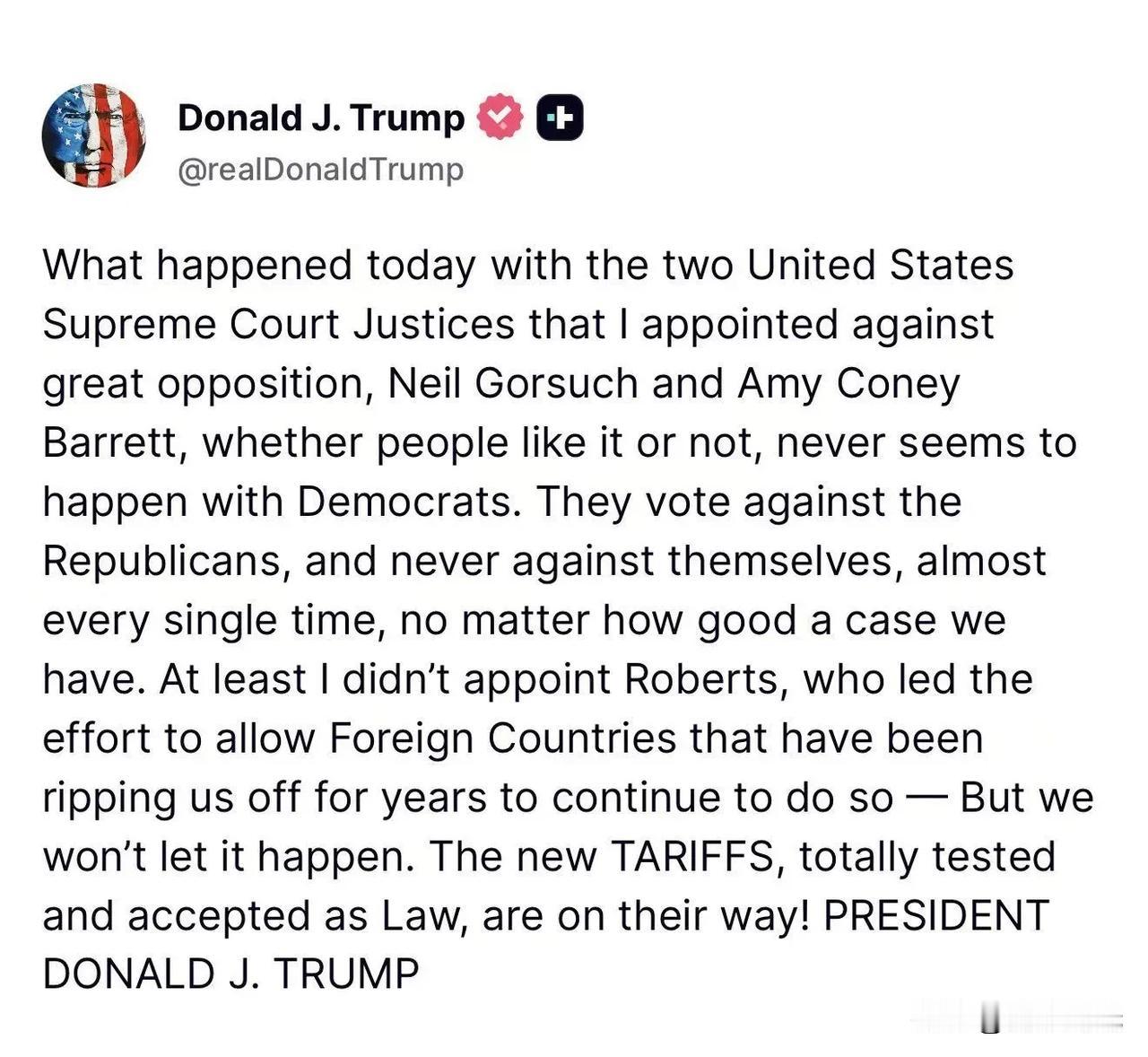 特朗普:今天,我任命的两名美国最高法院大法官一—尼尔·戈萨奇和艾米·科尼·巴雷特——尽管面临巨大阻力,但所发生的事情似乎从未发生在民主党人身上。无论人们喜欢与否,他们几乎每次都会投票反对共和党,而从不反对自己,无论我们的理由多么充分。至少我没有任命罗伯茨,他领导了允许多年来一直欺骗我们的外国国家继续这样做的努力——但我们不会让这种情况发生。全新的关税制度—一经过全面检验并被正式认可为法律——即将付诸实施!总统唐纳德·J·特朗普