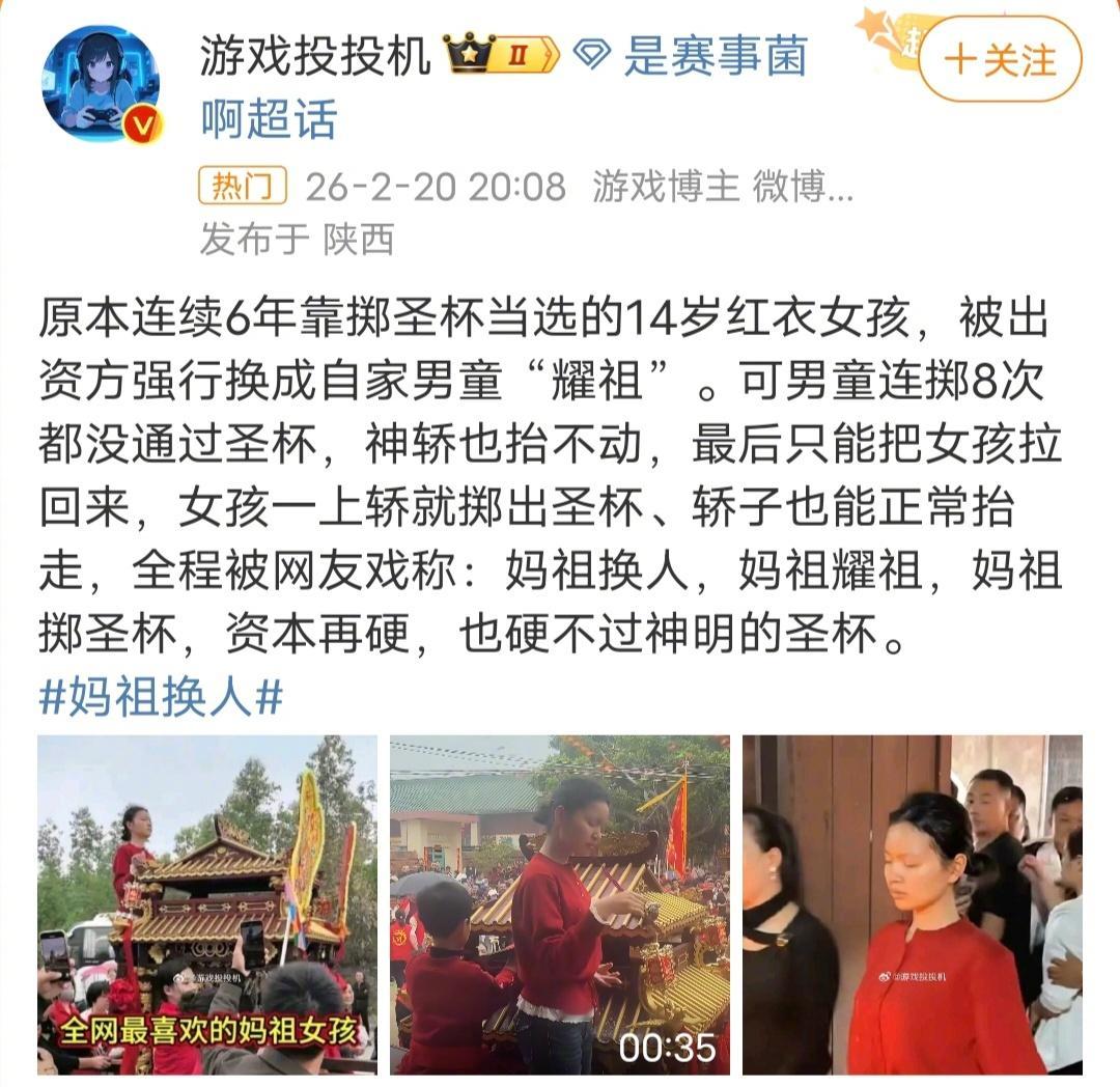 妈祖换人这个事情传得最火的就是“十余壮汉无法抬起轿子”,但是,我一直没有看到无法抬起轿子的这段视频,这究竟是真的,还是有些人为了流量编的?希望有人能把无法抬起轿子的视频发出来给大家看一下。