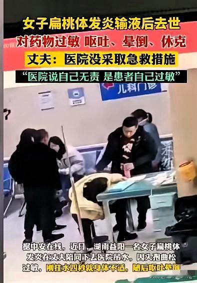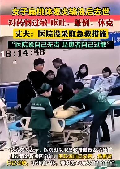 谁能想到,只是个扁桃体发炎的小毛病,输个液4秒就天人永隔,这真的太让人窒息了! 湖南益阳这位女子,输液前还好好跟丈夫说话,护士没问过敏史、没做皮试就直接上头孢曲松,药水刚进血管就胸闷呕吐,黄金4分钟里,护士拔针就走、护工视而不见,等抬上担架早就晚了。 医院一句“患者自身过敏”就想撇清责任,还拿11万人道主义赔偿打发,连遗体都不让家属看,这换谁能接受?就算头孢不强制皮试,问诊过敏史、过敏后立刻急救,这是最基本的医疗底线吧! 一条人命就因为流程缺位、急救滞后没了,小病送命的悲剧,真的不该再发生。你觉得医院这波操作,到底有没有过错?
