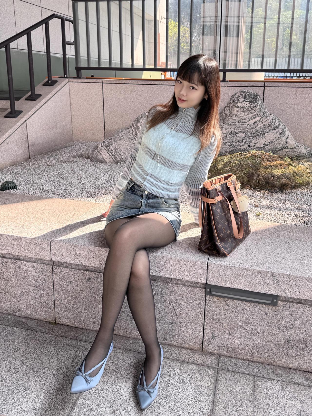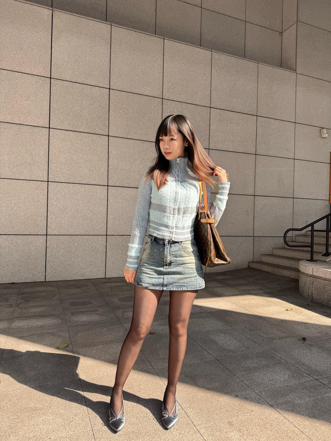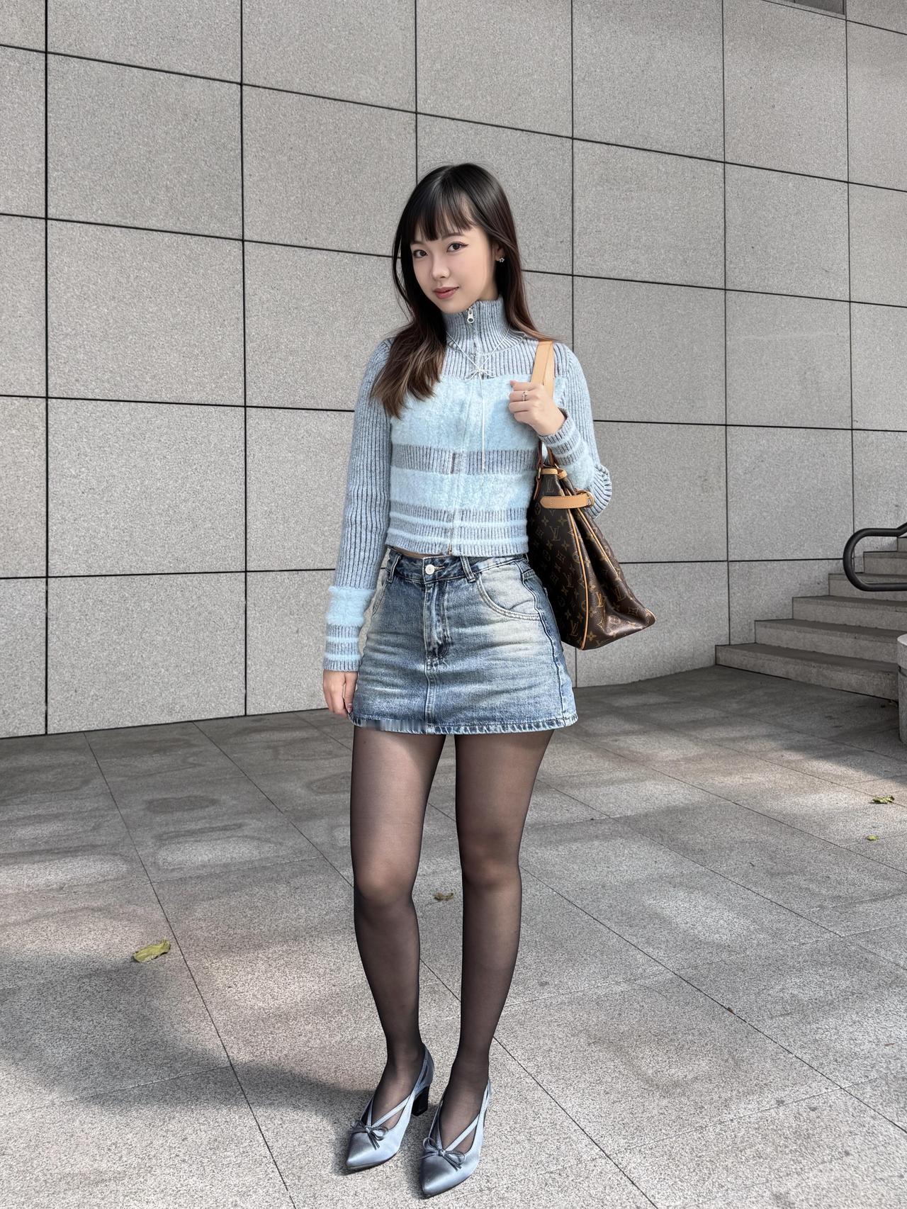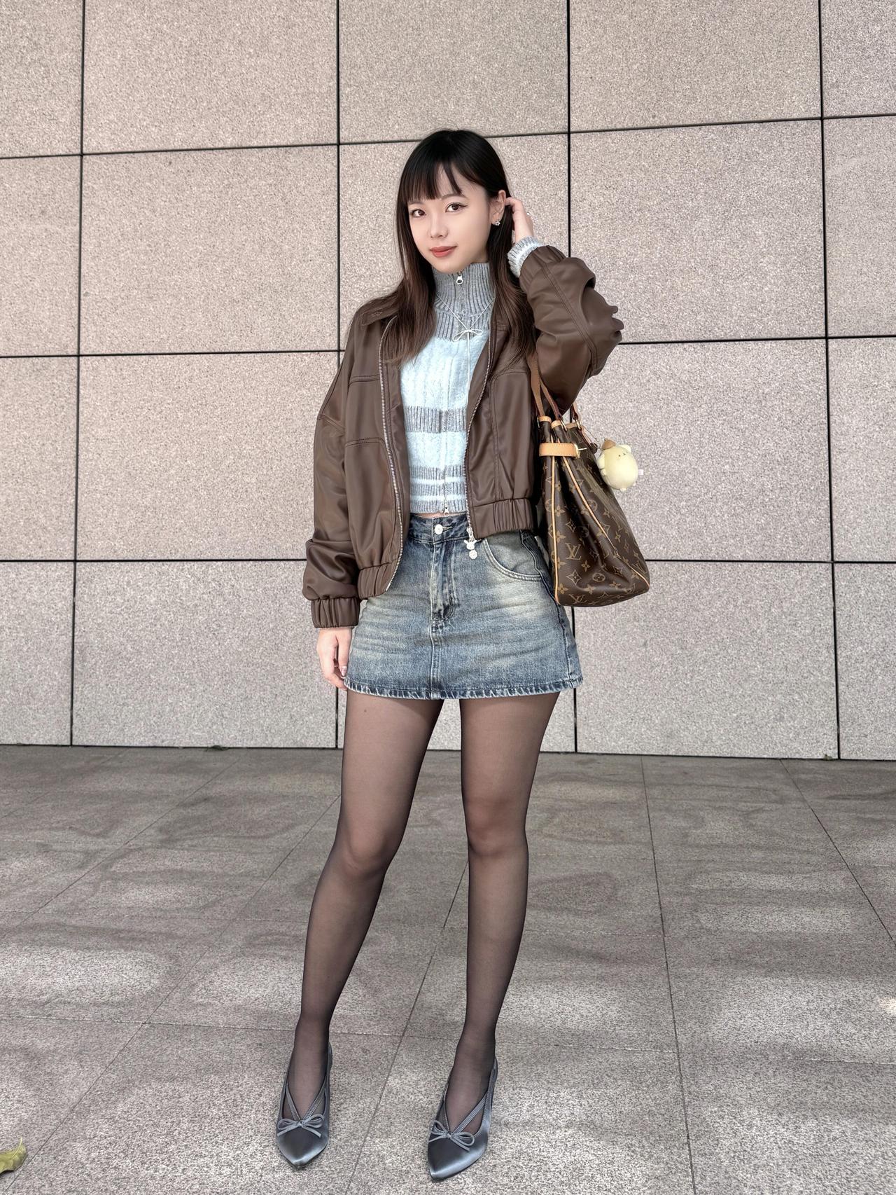 《都市丽人·秋日雅韵》 秋日暖阳照石墙,高楼林立映斜阳。 佳人独立风姿扬,时尚穿搭显端庄。 身披棕色皮夹克,短款修身显腰长。 内搭浅蓝针织衫,条纹点缀韵悠扬。 高领设计护颈项,柔软毛线暖心房。 下着牛仔短裙装,水洗蓝调显时尚。 裙摆微卷随风舞,青春活力满庭芳。 黑丝透肤显修长,双腿如玉步生香。 脚踏银色高跟鞋,蝴蝶结饰闪微光。 手提经典老花包,优雅气质自难藏。 长发披肩垂腰际,刘海齐眉更娇娘。 或站或坐姿态美,举手投足皆文章。 此情此景难描画,唯有诗篇记流光。 愿君常伴好时光,笑靥如花岁岁香。