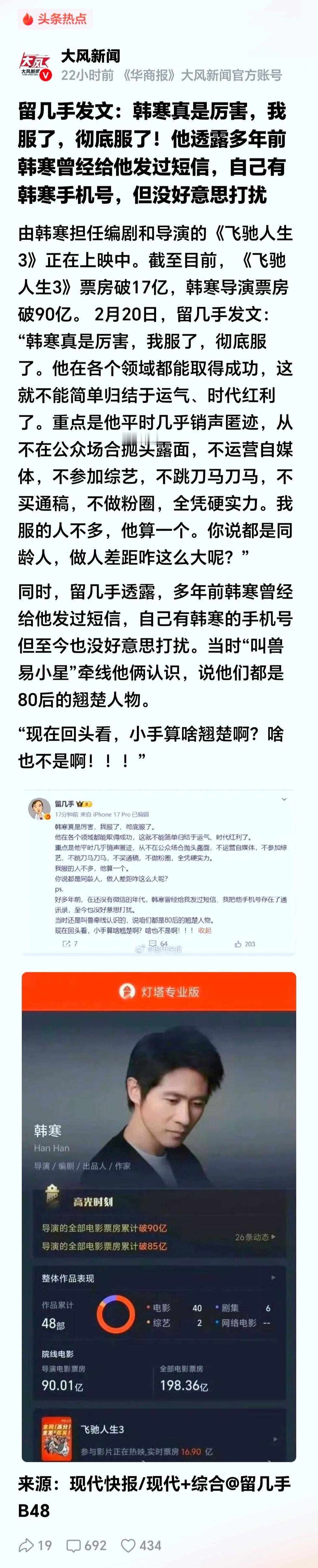 不是韩寒厉害,是他爸厉害。 厉害的也不是文笔,是能在2012年后的十几年安排好儿子的新路,目前看基本平安着陆了。 不是他家性格低调,是他们父子十几年前风波之后懂得从此必须低调。闷声生财,台前幕后。 不过,亭东影业就作品而言,我一直还是挺喜欢的。
