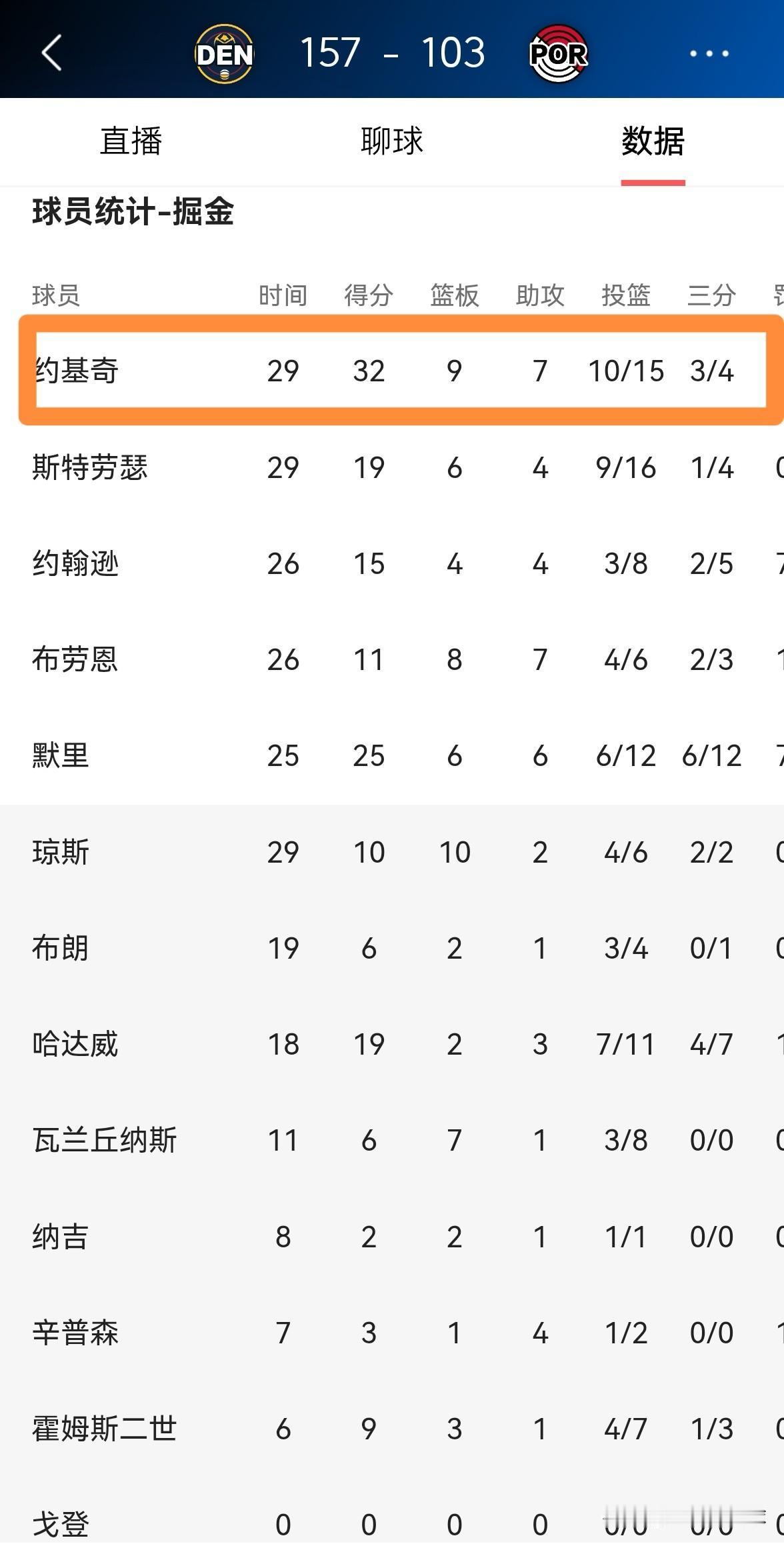 掘金巨星约基奇真是太不喜欢刷数据了!在今天掘金主场以157:103大胜开拓者的比赛中,约基奇原本可以轻松砍下三双,但是他却并没有执着于刷数据。 整场比赛下来,约基奇首发出战29分钟,投篮15中10,其中三分球4中3、罚球11中9轻松砍下32分9篮板7助攻4抢断,他的场上正负值为+40。 实事求是的说,约基奇是当今联盟最不喜欢刷数据的球员之一,他在场上的表现完全是为了能够帮助球队赢球。