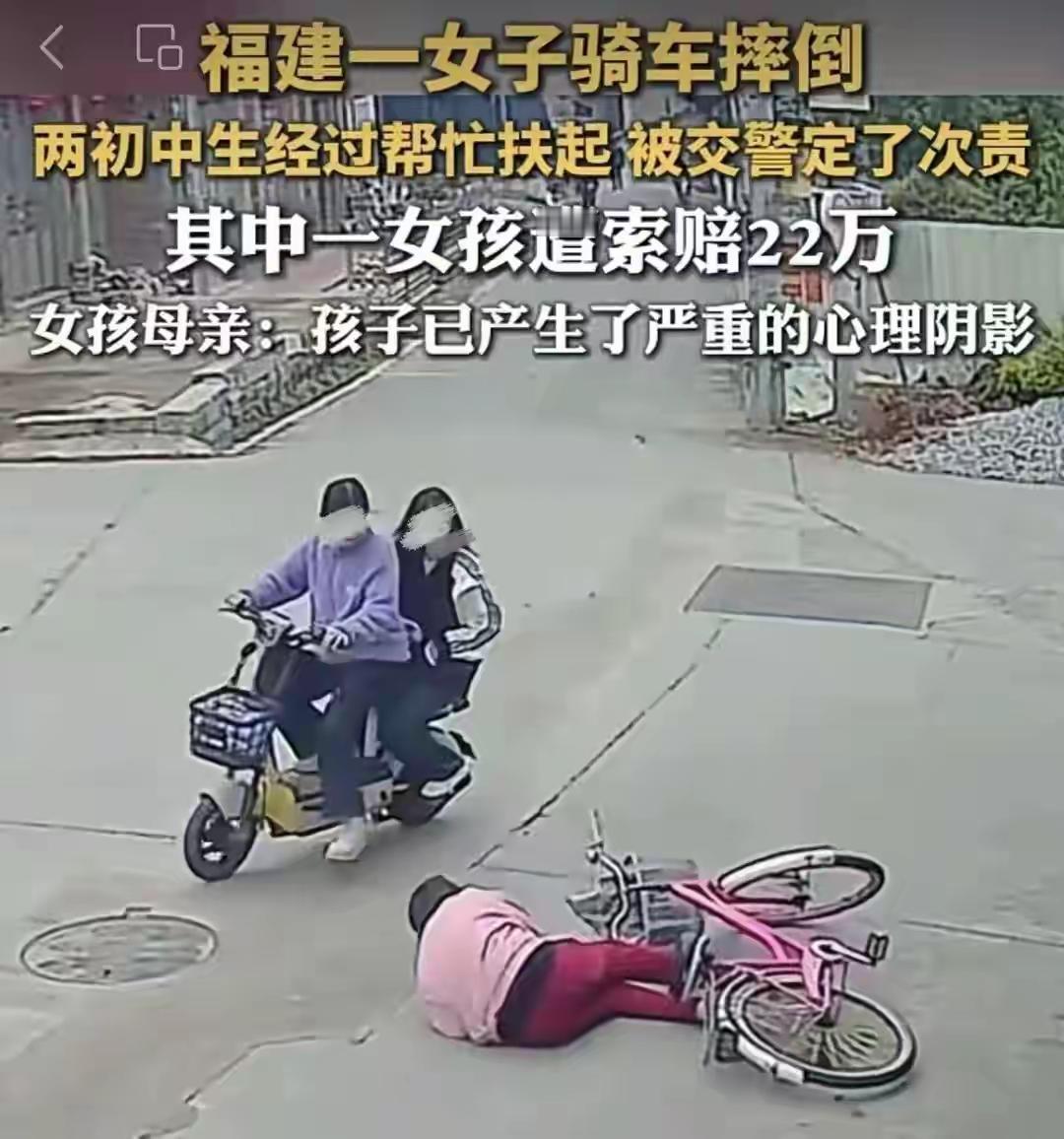 福建两女生扶起摔倒老人,律师解读: 老人声称:受到惊吓后摔倒 警方裁定:女生负次要责任 赔偿结果:一女生被索赔22万元 律师解读: 若查实老人受惊吓摔倒与女孩骑行行为存在因果关系,依据《民法典》侵权责任,按照女孩、白色车辆(如有过错)、老人三方的过错程度与原因力大小确定按份责任。 此事再次引发“老人摔倒扶与不扶”老话题的热议 最大的争议就是警方的裁定。女孩无碰撞无接触,主动扶起摔倒老人有错吗?女孩善良有错吗? 好在有视频,有图有真相,这就是最好的证据。 此事,即将开庭,希望: 依据视频,厘清责任,还女孩公道,保护少年心中的那份善良与美好。 此事如果裁定不公,伤害的不仅仅是做好事的少年的心,可能从此更没有人敢扶起摔倒的老人,社会风气将被再次破坏。 扶起老人被讹 扶人责任争议
