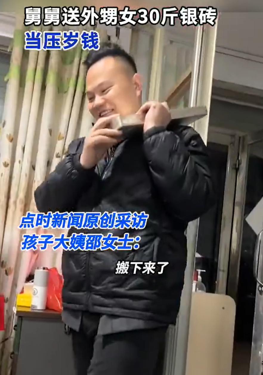 这个舅舅火了!山东临沂,女子带着女儿回家过年,吃年夜饭时,孩子的舅舅喝了不少酒,见外甥女给她磕头拜年,直接把车里价值30多万的银砖拿出来送给孩子。网友:我舅舅300都不舍得给 每年春节关于舅舅的段子就没断过,有把300块折叠成600块糊弄外甥的,有用500块现金加练功券搞出5万块排面的,不过这位舅舅却玩了一把大的 大年三十晚上,这一家子刚吃完年夜饭,气氛正热乎着。舅舅那天高兴,酒也没少喝,脸红扑扑的,看着满屋子的热闹劲儿,心里头舒坦 这时候,他那5岁的小外甥女,乖巧地走过来,往地上一跪,小脑袋瓜子磕下去,嘴里还念叨着拜年的吉祥话,给舅舅讨压岁钱 舅舅一看这孩子这么懂事,乐得嘴都合不拢了。他大手一挥,对着孩子说:给舅舅磕头拜年,舅舅送你个大宝贝! 说完,他晃晃悠悠站起身,拽着孩子就往外走。一帮大人还纳闷呢,这是要干啥?结果舅舅打开车门,弯腰一使劲,从车里抱下来一个沉甸甸的东西,一块大银砖 这可不是开玩笑的那种小银条,是真真正正的银砖,30斤重 据家里人说,这块银子按现在的市价算,值三十多万。舅舅抱着这块银砖,当着全家人的面,跟外甥女说:磕头了,这块银子就是你的了! 一个5岁的孩子,可能对三十万没什么概念,但她知道这是舅舅给的好东西,高兴得不得了。这一幕把在场的家人都看愣了 孩子的大姨后来跟人说,哥哥平时就特别疼这个外甥女,真是当成自己亲生的闺女来宠,但谁也没想到,他能疼到这个份上,酒劲一上来,几十万的东西说送就送了 不过第二天,孩子家长觉得这个太贵重,最终还是退了回来,而舅舅随后又送给外甥女一块几十克、价值1000多元带“压岁钱”字样的银砖 说实话,这样的家庭氛围,真的让人羡慕,春节过的是啥?过的就是这个人情味儿。但这个味儿,得刚刚好。太淡了,没意思;太浓了,又呛得慌。就像这家人,一个敢给,一个敢收(然后又还了),最后落在一个彼此都舒服的位置上