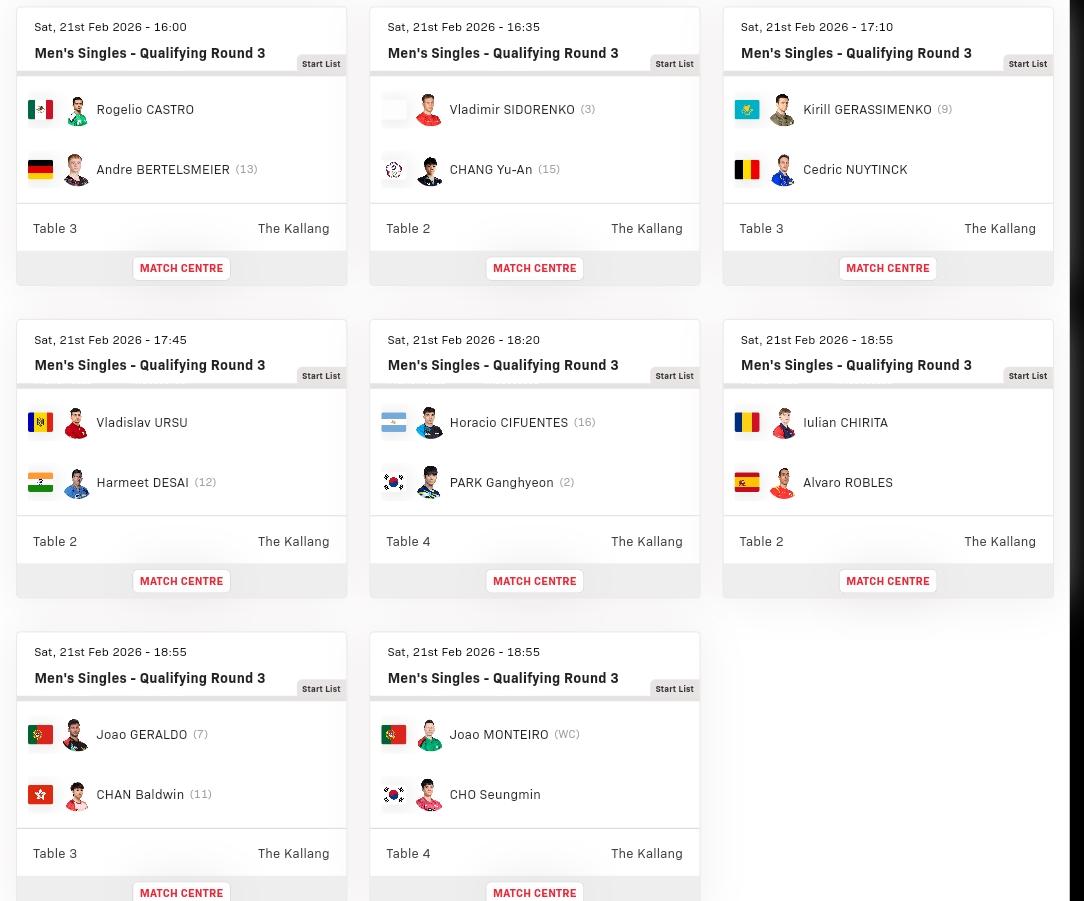 新加坡大满贯赛男单决赛轮下午4点开打,将决出8个晋级正赛名额。 陈颢桦 蒙泰罗 赵胜敏 奇里塔 罗伯勒斯 格拉尔多 朴康贤 德赛 卡斯特罗 张佑安 格拉斯门科 努伊提克 希德仁科 贝特斯迈尔 西福恩特斯 乌尔苏。