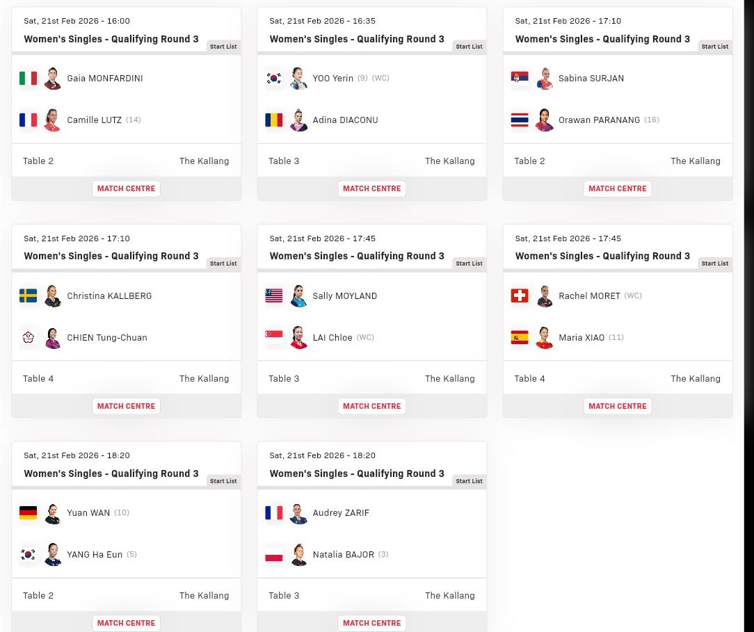 新加坡大满贯赛女单资格赛决胜轮16位名单出来了,将决出八个晋级者。 肖瑶茜 扎里夫 巴约 万远 梁夏银 莫雷特 黎嬣萱 苏尔詹 刘叡潾 简彤娟 帕拉南 迪亚克努 卡尔伯格 卡.卢茨 蒙法蒂尼 陈伊依。