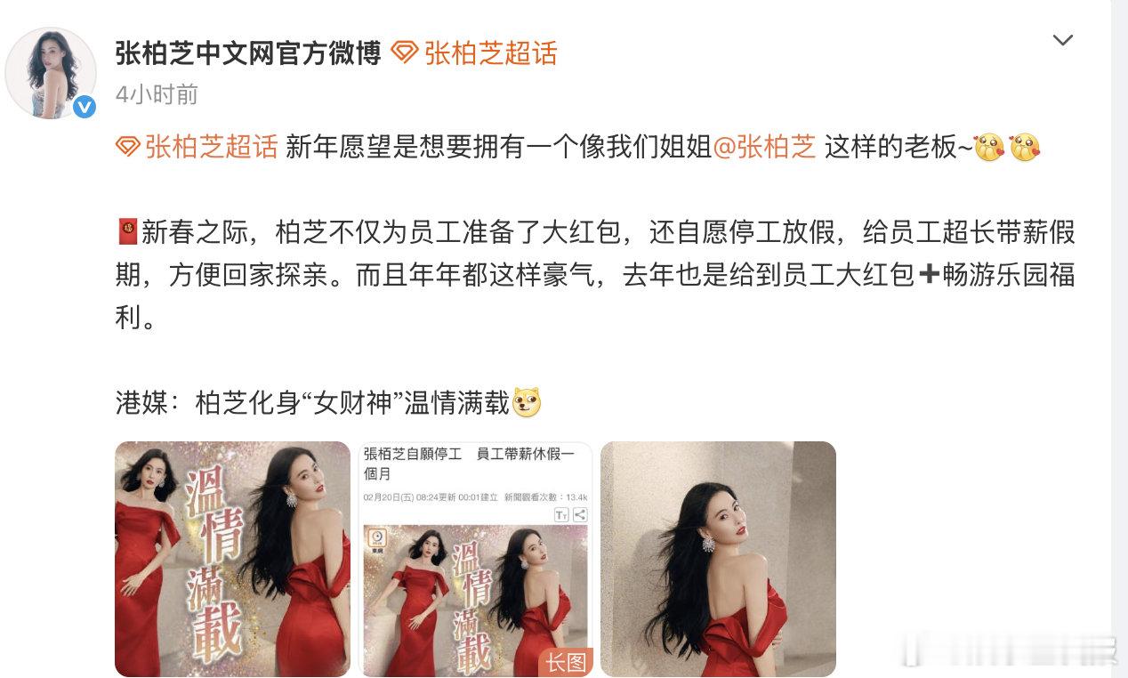 张柏芝让员工带薪休假一个月张柏芝给员工发超大红包 据港媒,张柏芝今年宠员工超大手笔!不仅派发超大红包,还直接停工,让员工带薪休一个月长假安心过年,妥妥的 “女财神” 本神,也太让人羡慕了吧