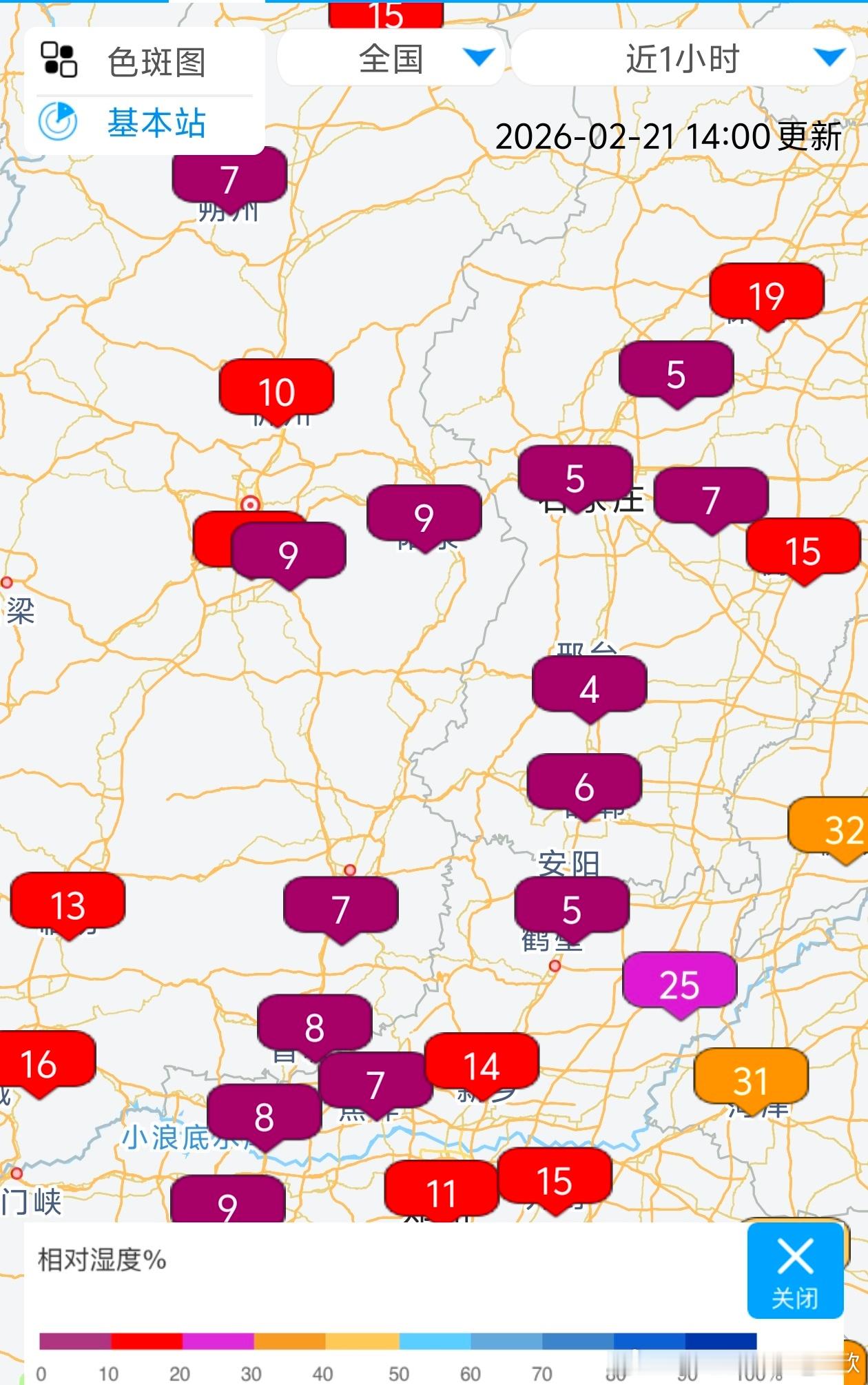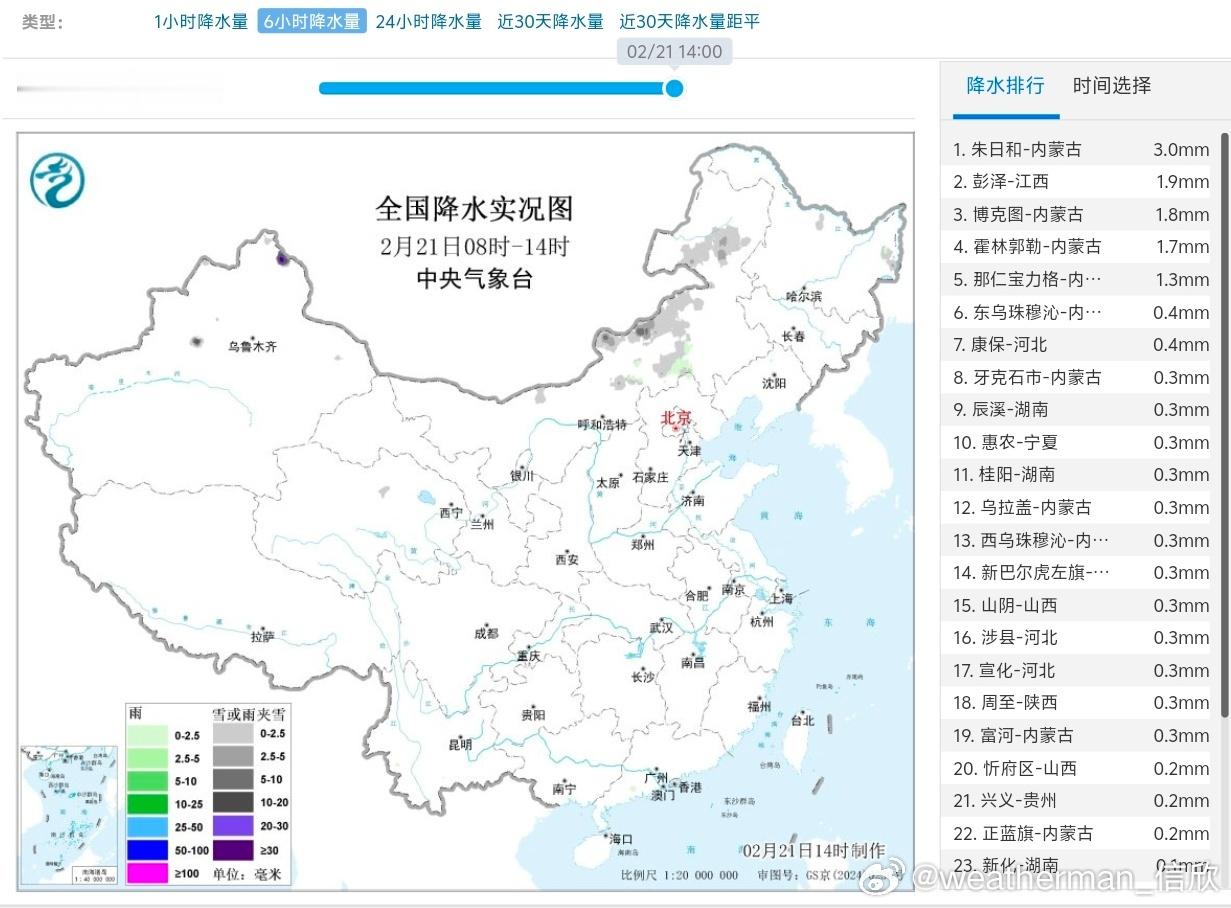 【雨雪】今天08-14时内蒙古降雪增多,朱日和3毫米为全国6小时降水量最大站点。今天青藏高原到华北平原多地空气依然干燥。山西河北河南部分站点14时相对湿度不足10%,河北邢台只有4%。