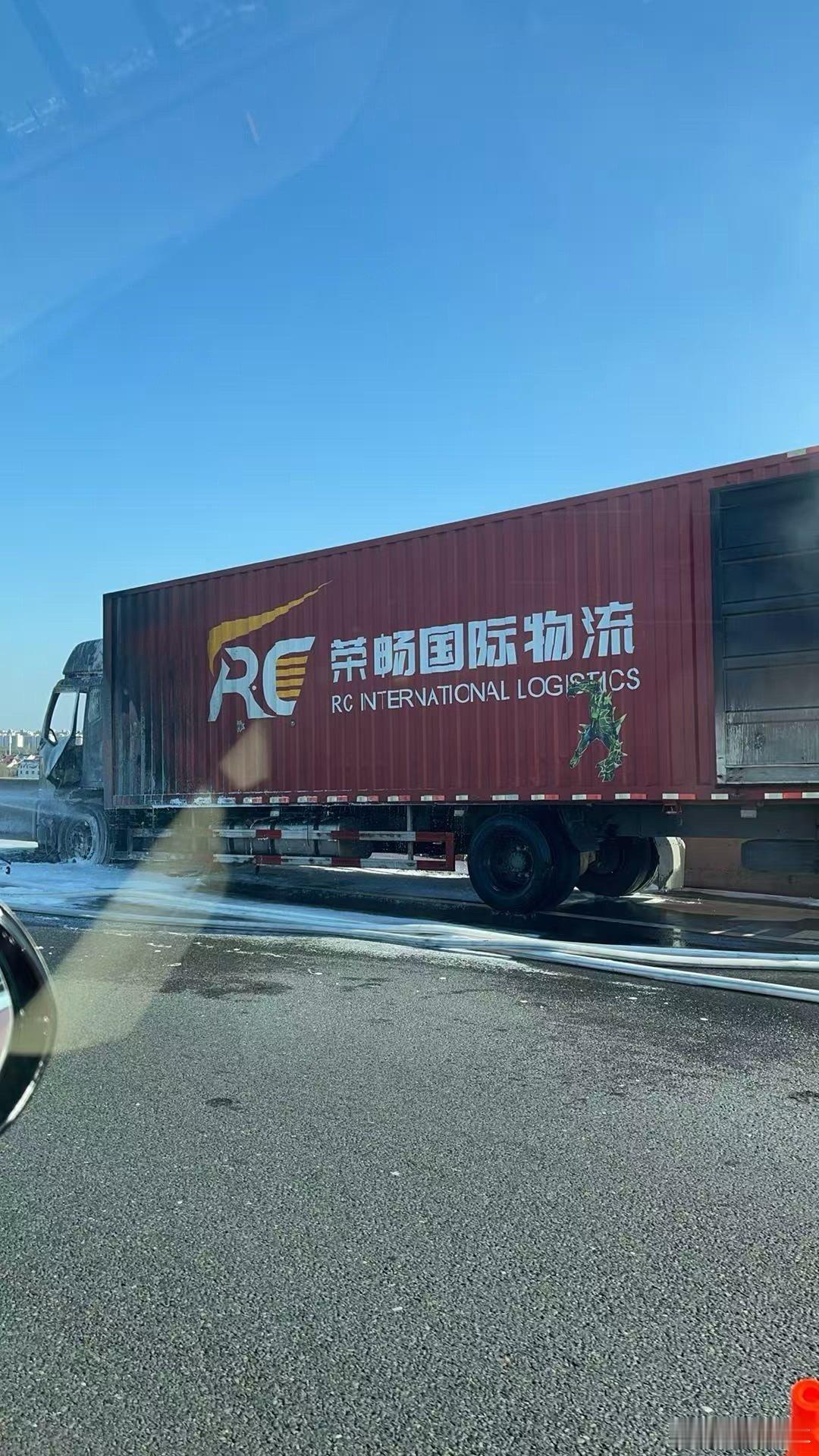 在杭州到上海的高速上一国际物流车着火了希望人没事