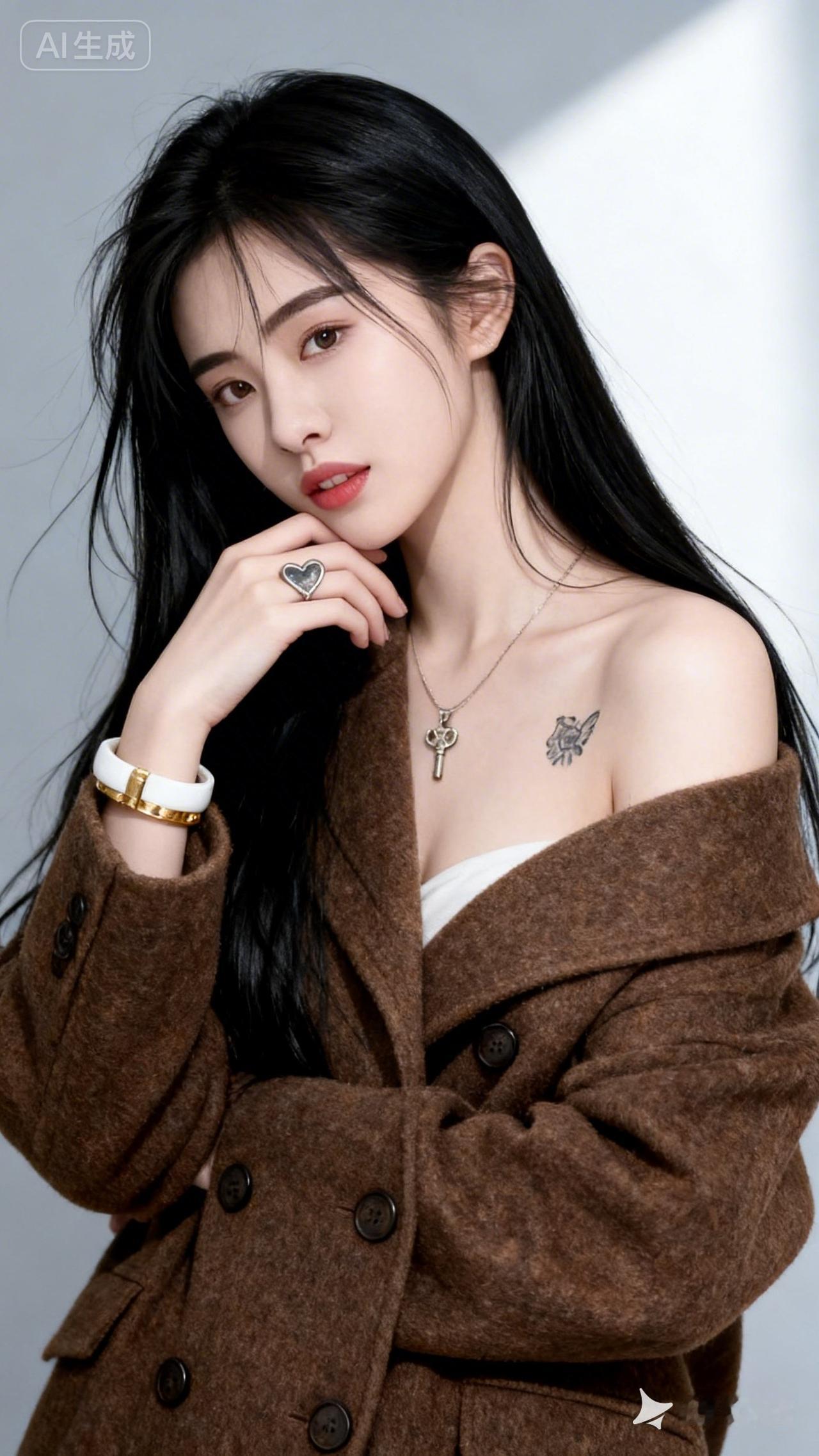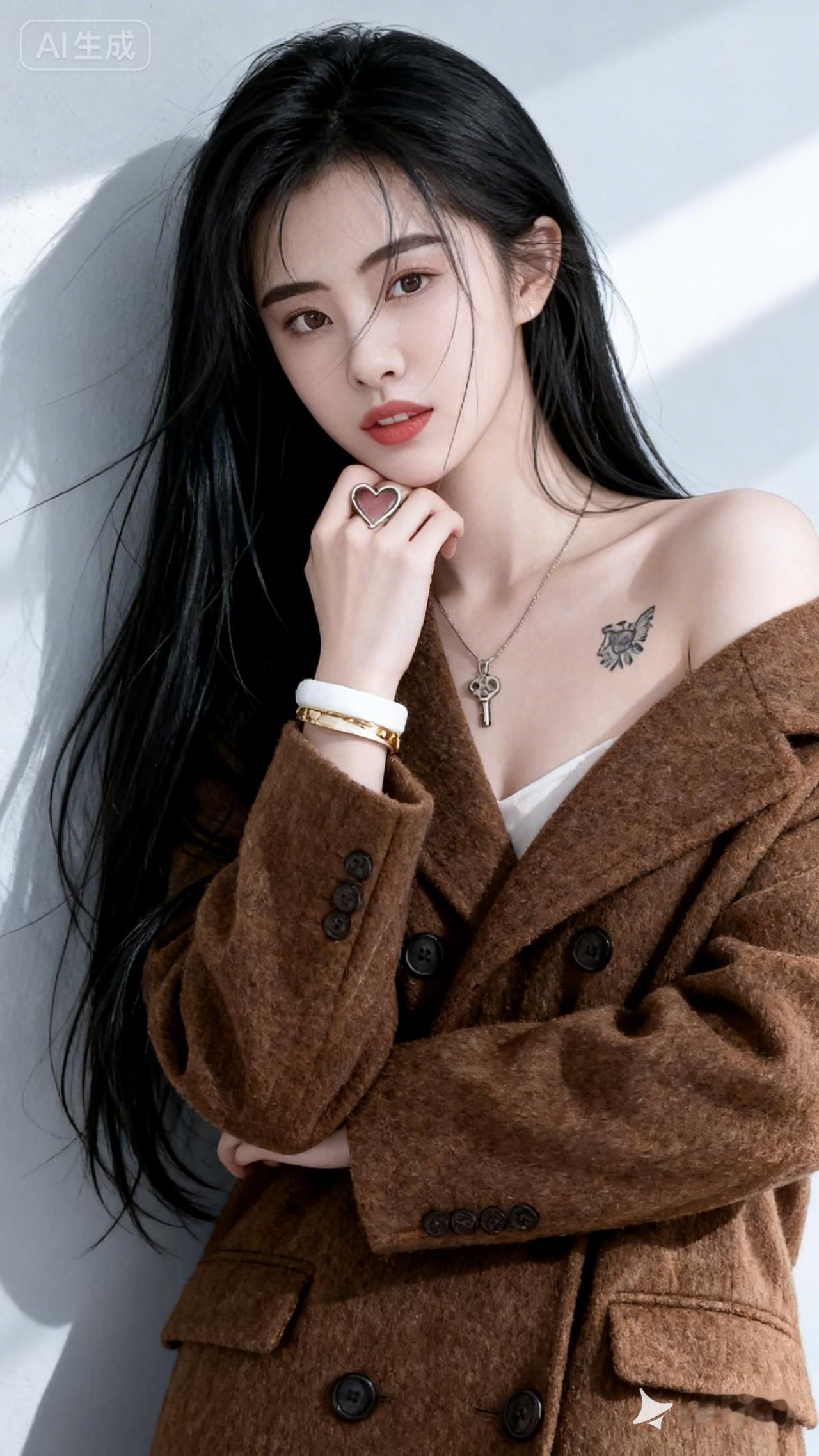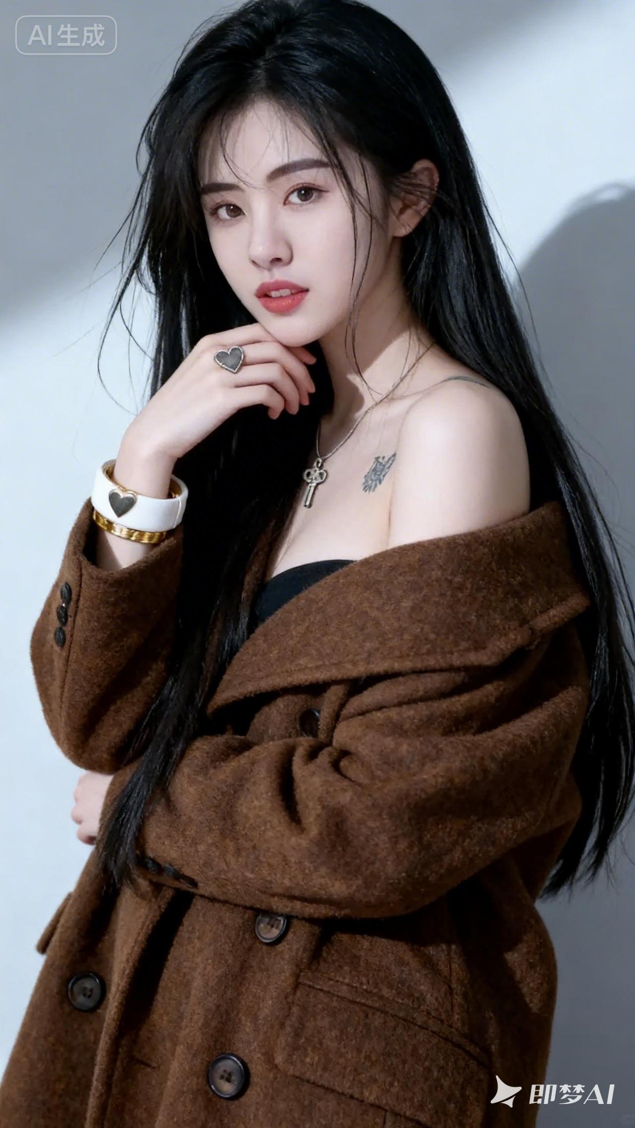 温柔黑发少女,棕色大衣,心型项链,复古优雅。