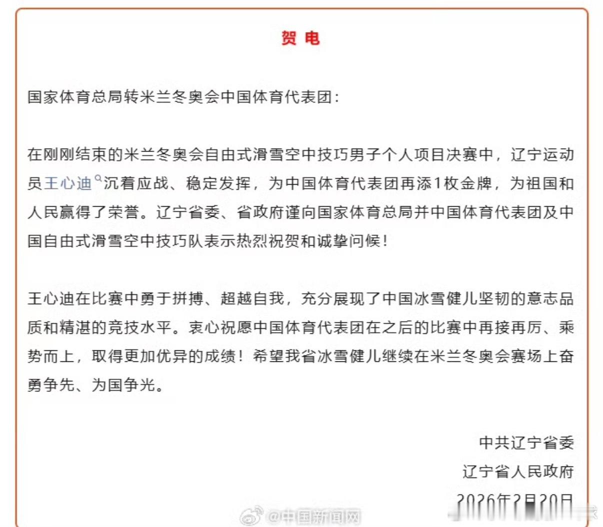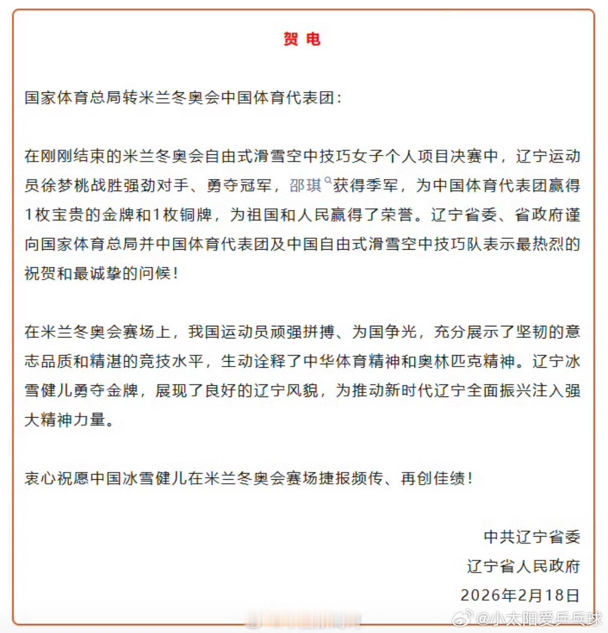 辽宁省委省政府祝贺双金夫妻档从徐梦桃的“桃心金牌”到王心迪的空中绽放,这对冠军夫妻用实力书写了冰雪传奇。辽宁省委省政府的祝贺,不仅是对他们个人成就的肯定,更是对中国冰雪健儿拼搏精神的致敬。金牌是荣誉,更是他们并肩作战、为国争光的最好见证。
