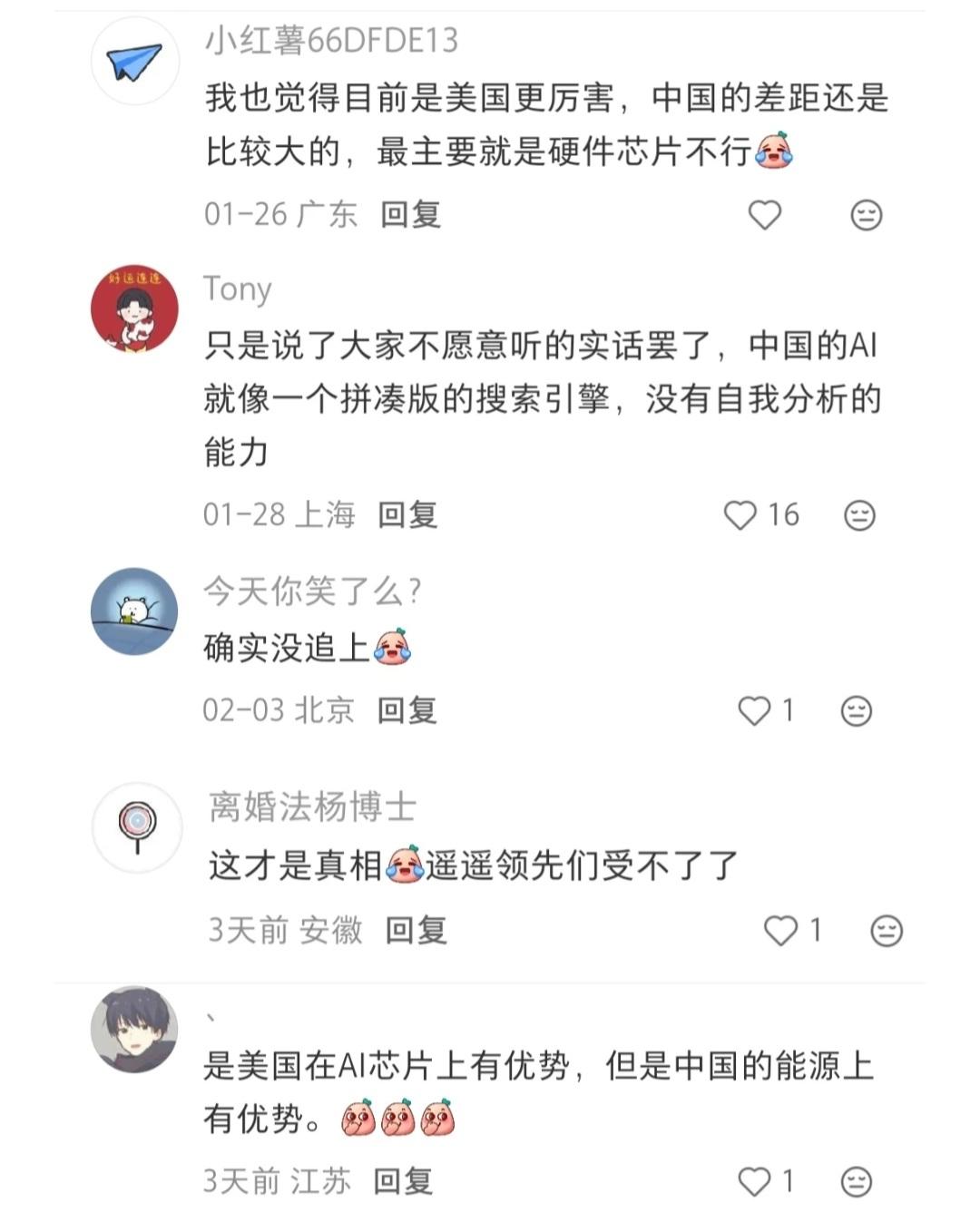 春晚Al热刚过,有专家称中国Al追不上美国。 我看到网上有消息称Claude母公司Anthropic CEO Dario Amodei(达里奥·阿莫迪)被问及与中国AI竞争时表示:中国AI没戏。 (Anthropic是一家总部位于美国加州旧金山的人工智能安全与研究公司,2026年2月刚完成了300亿美元的超级融资,投后估值高达3800亿美元。此轮融资吸引了包括微软、英伟达、红杉资本、新加坡政府投资公司等全球顶级资本和国家主权基金参与)。 部分网友也同意这个说法: 我也觉得目前是美国更厉害,中国的差距还是比较大的,最主要就是硬件芯片不行。 是美国在AI芯片上有优势,但是中国的能源上有优势。 这才是真相。遥遥领先们受不了了。 各位有啥看法? @真业心学创始人东方赢 欢迎评论。