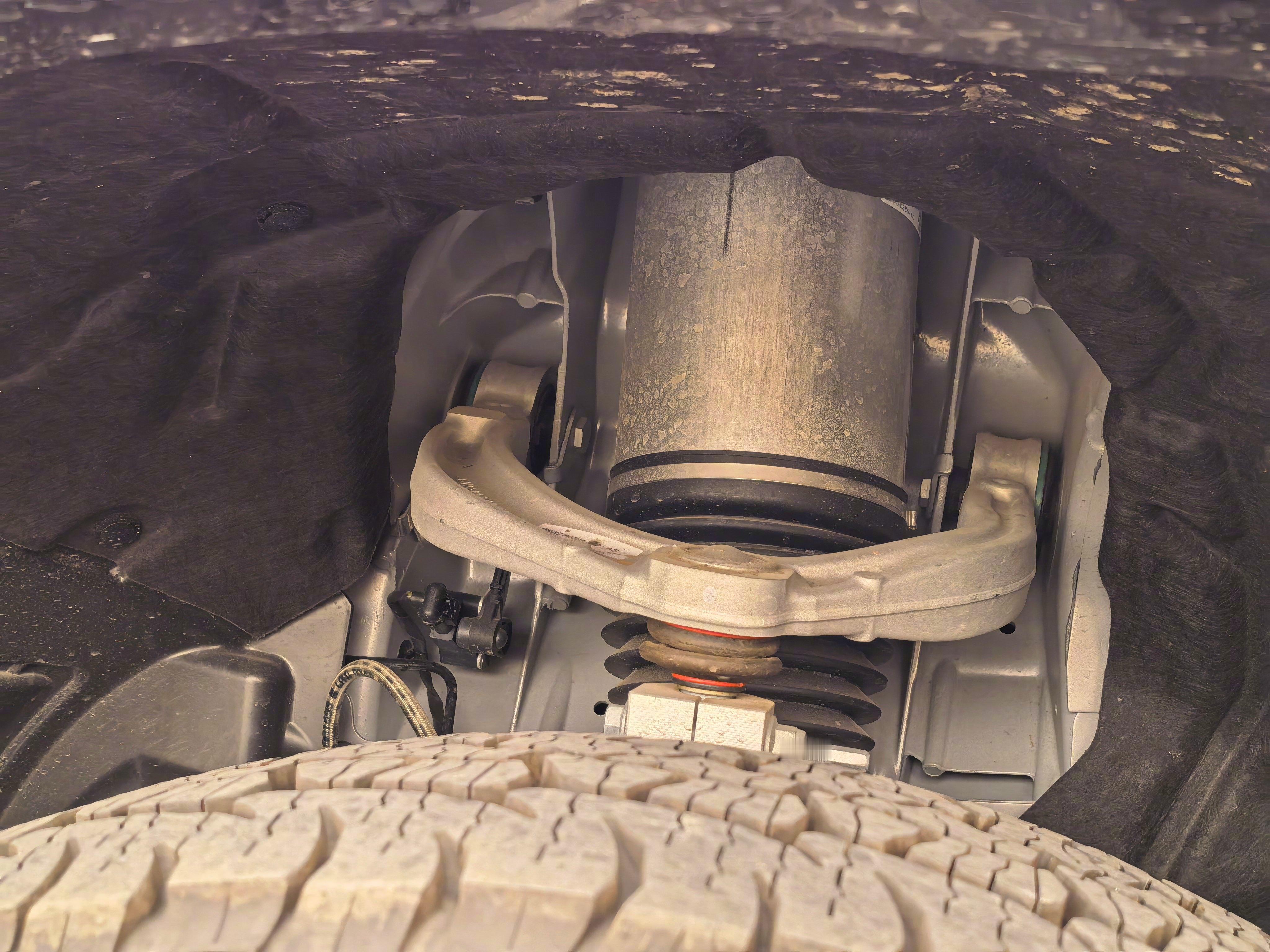 然后就是越野性能了,路边的大水沟,停车挂低速四驱、悬架升到最高,直接咔咔完全没感觉就过去了,全程非常丝滑。因为悬架升的巨高,接近角和离去角巨大,脑袋直接扎水沟里,也蹭不到前唇。