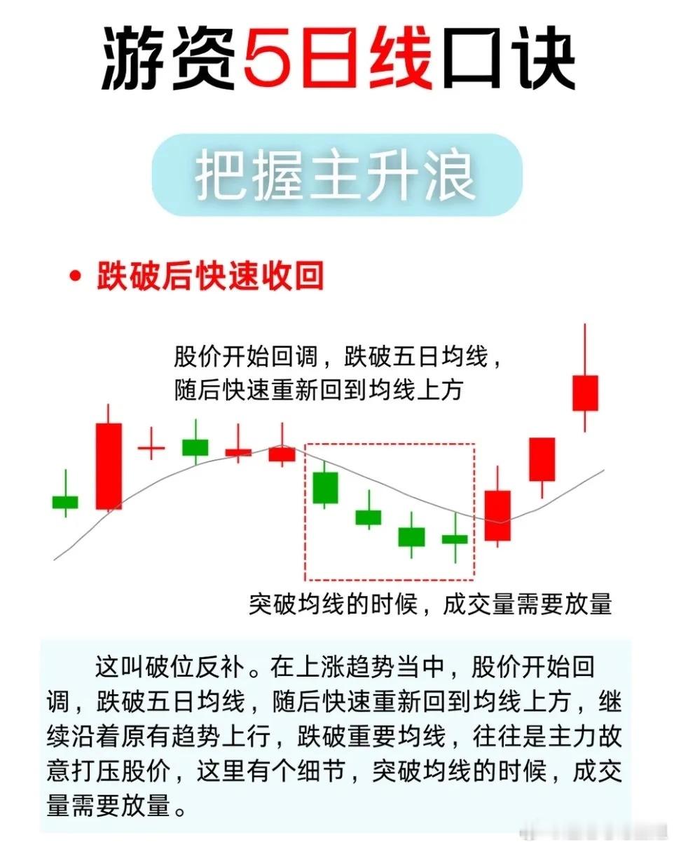 1. 跌破后快速收回(破位反补)股价在上涨趋势中回调,短暂跌破5日均线后,又快速放量重回均线上方。这往往是主力故意打压洗盘,清洗浮筹后继续拉升的信号,是绝佳的低吸机会。关键细节:突破均线时必须放量,否则可能是假反弹。