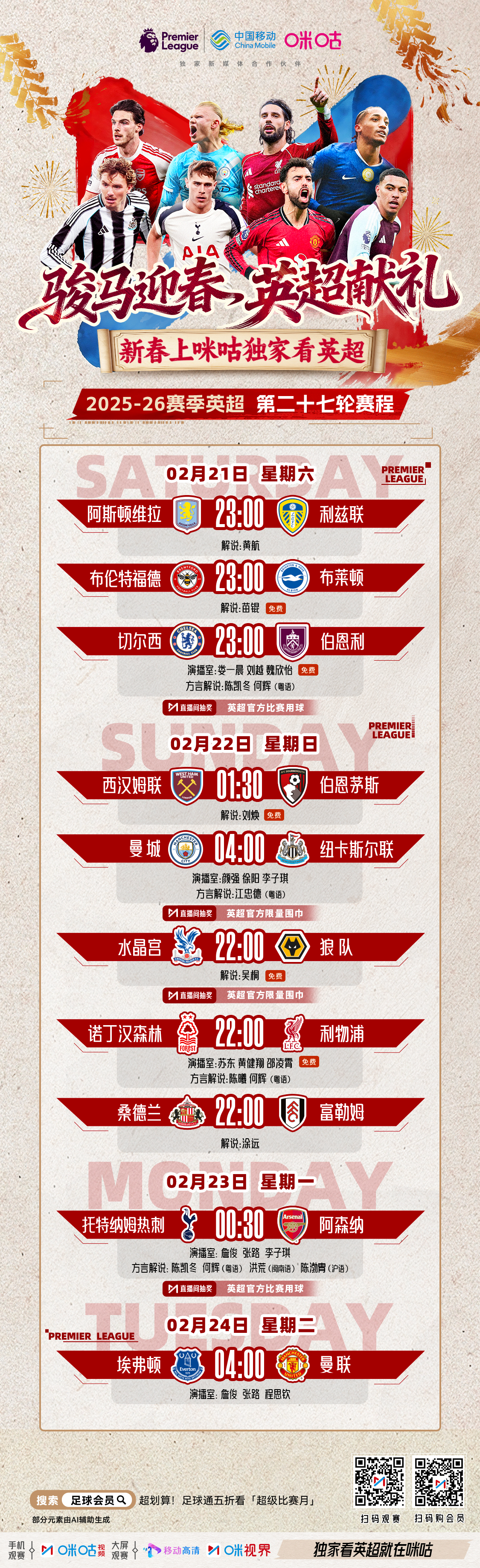 🦁 𝗣𝗿𝗲𝗺𝗶𝗲𝗿 𝗟𝗲𝗮𝗴𝘂𝗲 英超第二十七轮来袭📆 完整赛程及排播出炉✍️ 马年你对主队的期待是?#独家看英超就在咪咕##新春尽享五大联赛只在咪咕# 📲网页链接