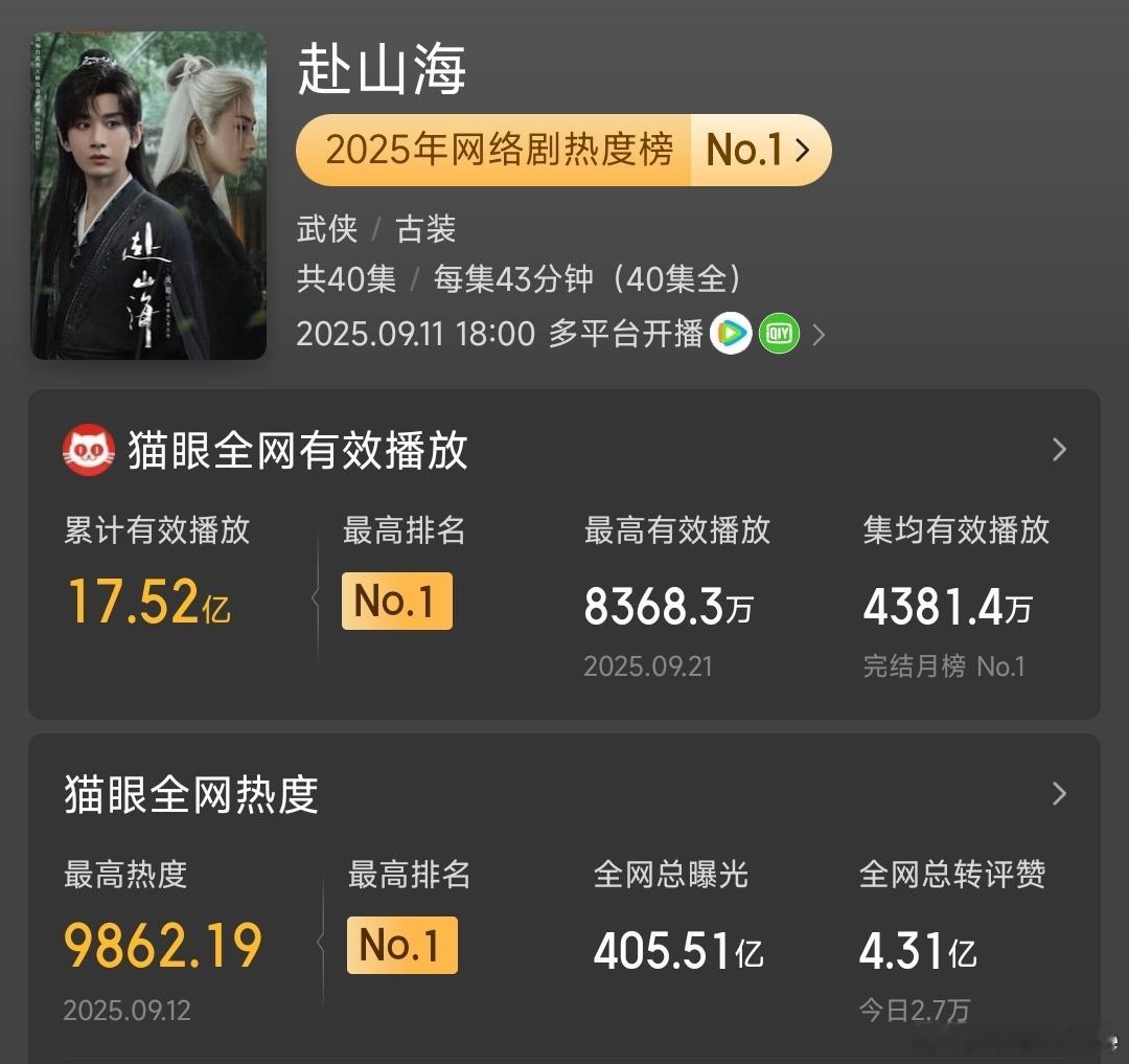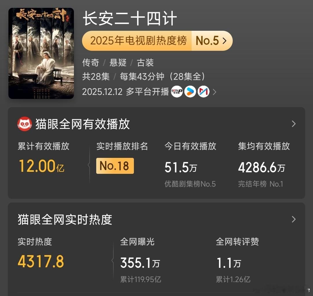 有了《赴山海》的磨砺,再到《天地剑心》,全网曝光732.17亿,我儿曹植,之后的《长安二十四计》,集均4286.6万,过硬的剧情,层层反转的计谋,深刻有内涵的隐喻,从谢淮安复仇到守护长安,让每个人都不必为米面发愁,让每个人都能看到花开,主题升华,这种升华还指代了中国百年近代史,格局之大,跑一百步,自然而然。