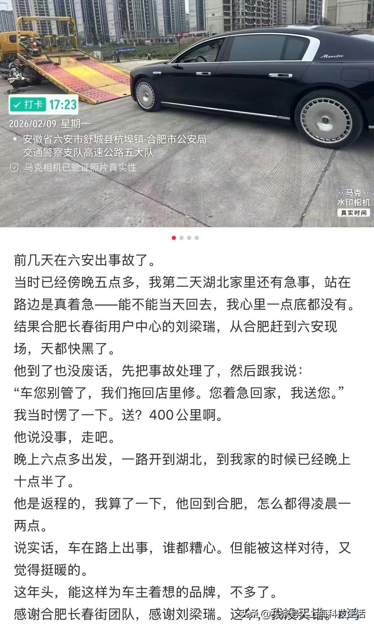 刷到一位尊界S800车友,在六安被追尾(看图片应该是),合肥的售后跨城到现场服务,车辆直接拖回合肥的长春街用户中心维修。 最关键的是,售后服务人员开车400公里 送客户回湖北的家。这种服务能力,确实符合豪华品牌的价值观和服务意识。鸿蒙智行👍