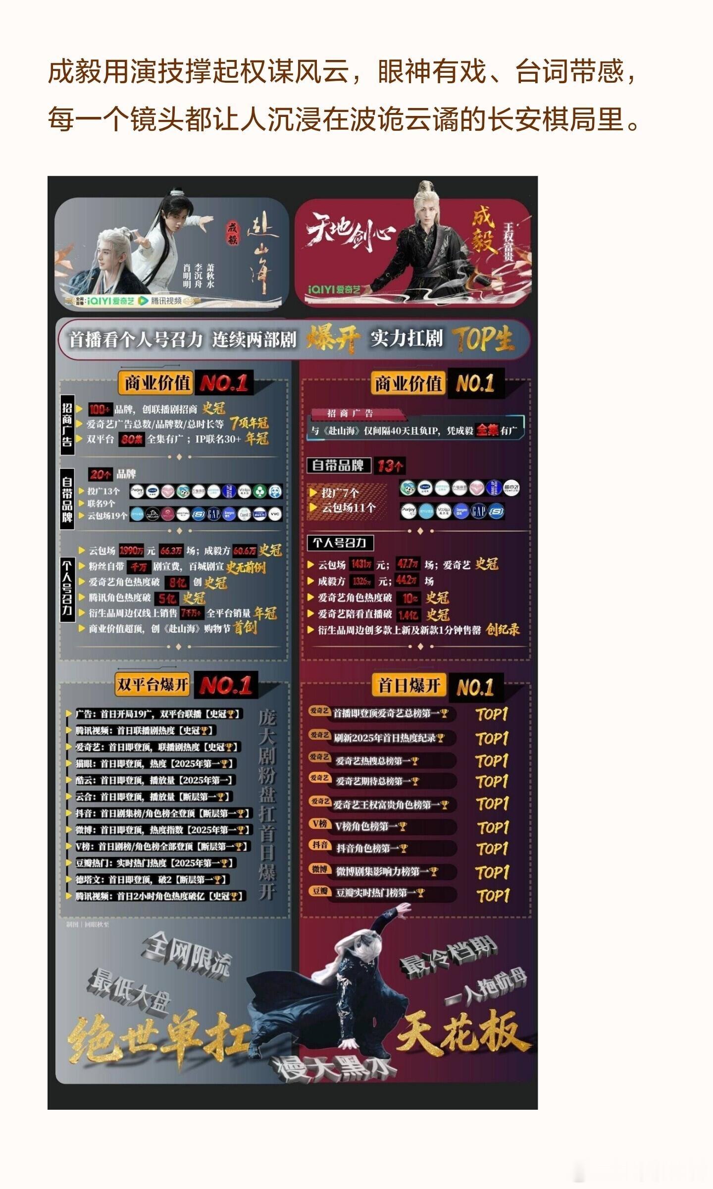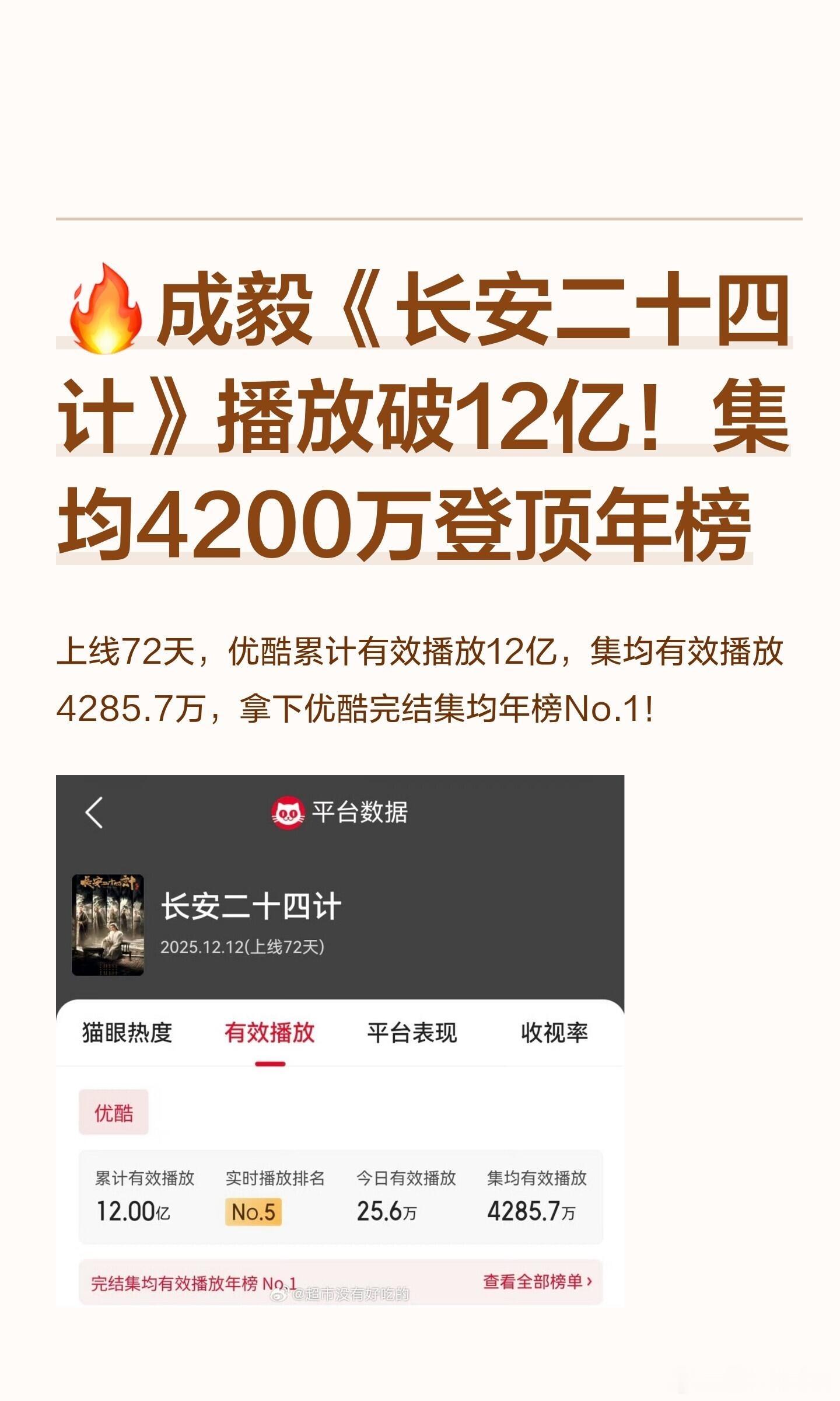 成毅《长安二十四计》播放总量破12亿,集均达到4200登顶年榜。