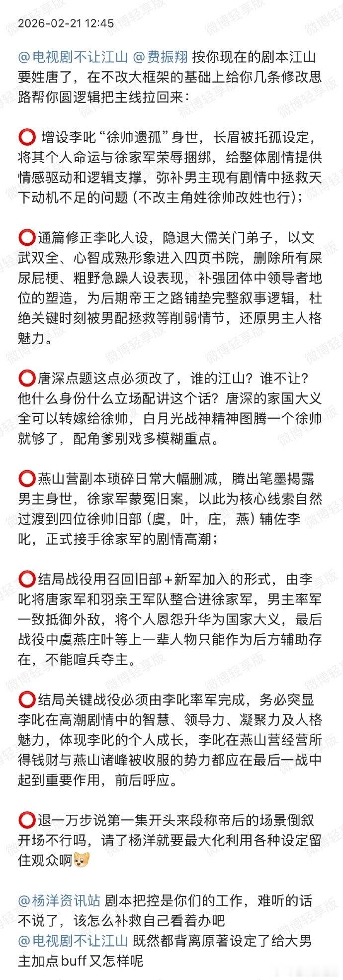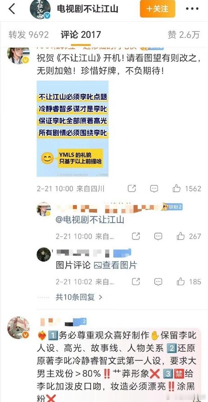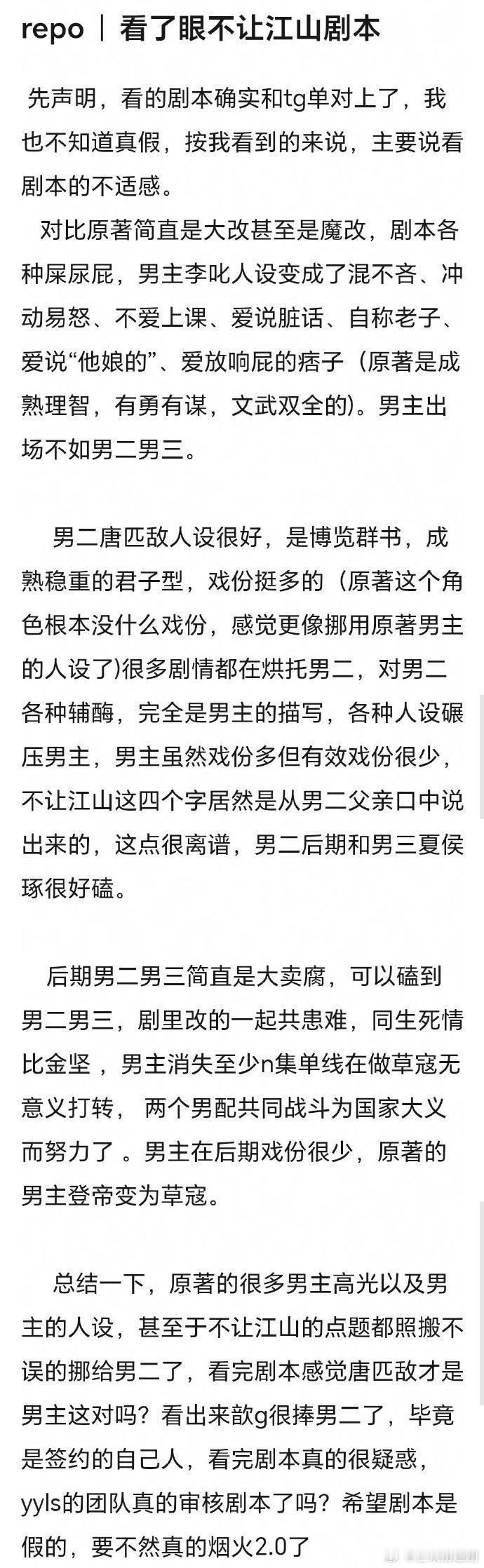 大男主剧《不让江山》 刚官宣杨洋,粉丝就开始wq了。起因是有人发了疑似剧本,说男主人设不及男二,弱化男主变成脏话随口就来的小混混,还加入了吻戏