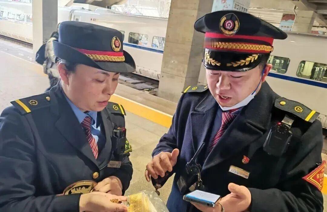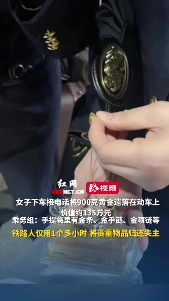 135万黄金转眼遗失,谁能体会这份心急如焚? (个人观点仅供参考,无任何不良引导) 2月20日,一名女子在动车停靠期间下车接听电话,一时疏忽竟将装有贵重黄金的手提袋遗落在车厢之内。袋中900克黄金包含金条、金手链与金项链,折算价值高达135万元,如此巨额财物遗失,任谁都会惊慌失措。 财物遗失不过片刻,求助之声即刻响起。铁路工作人员听闻此事,丝毫不敢怠慢,迅速联动列车乘务组展开寻找。众人分工明确行动迅速,第一时间锁定遗失物品所在车厢,顺利找到无人看管的手提袋,并妥善保管确保分毫未损。从接到求助到物归原主,全程仅耗时一个多小时,如此高效的处置,堪称神速。 常言道,细节见真章,危难显担当。铁路工作人员用最快的速度、最负责的态度,挽回了旅客的巨额损失,上演了一幕暖心的失而复得。出门在外,粗心大意在所难免,正是这些坚守岗位、尽职尽责的守护者,让旅途多了一份安心与保障。 小事彰显大爱,速度诠释责任。此次黄金归还事件,不仅是一次财物的找回,更是一份信任的传递,也提醒着每一位出行之人,旅途之中务必看管好随身物品,平安出行,安心归家。