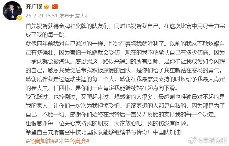 #齐广璞飞跃过摔倒过又爬起来过##齐广璞发博总结米兰冬奥#用每一跳致敬热爱、致敬团队、致敬家人。飞跃过,摔倒过,又勇敢爬起来。#林孝埈想边旅行边学中文##教练辟谣不让苏翊鸣谈恋爱##苏翊鸣让世界看到中国单板滑雪#(编辑:惠天骄;审签:岑杰昌)