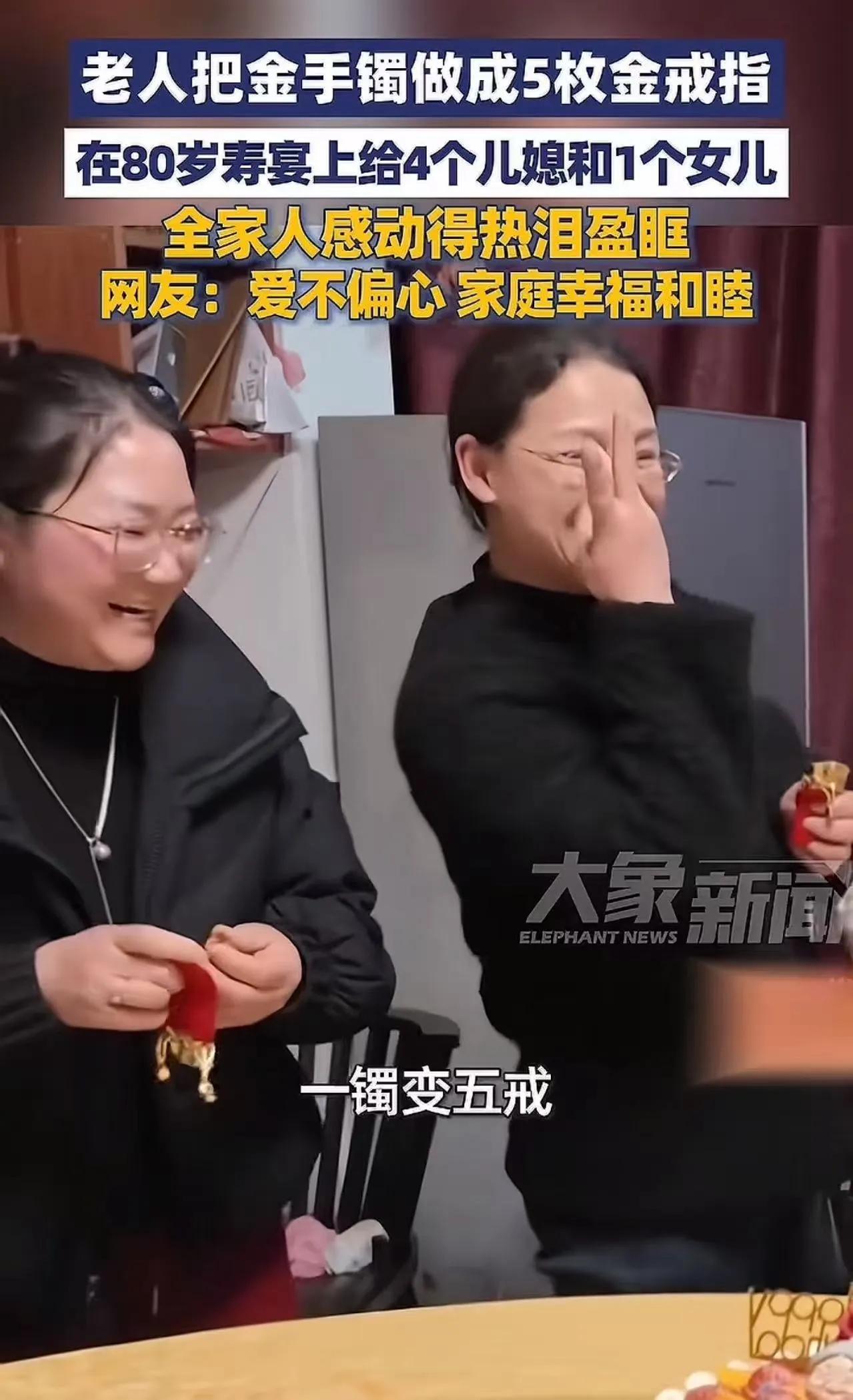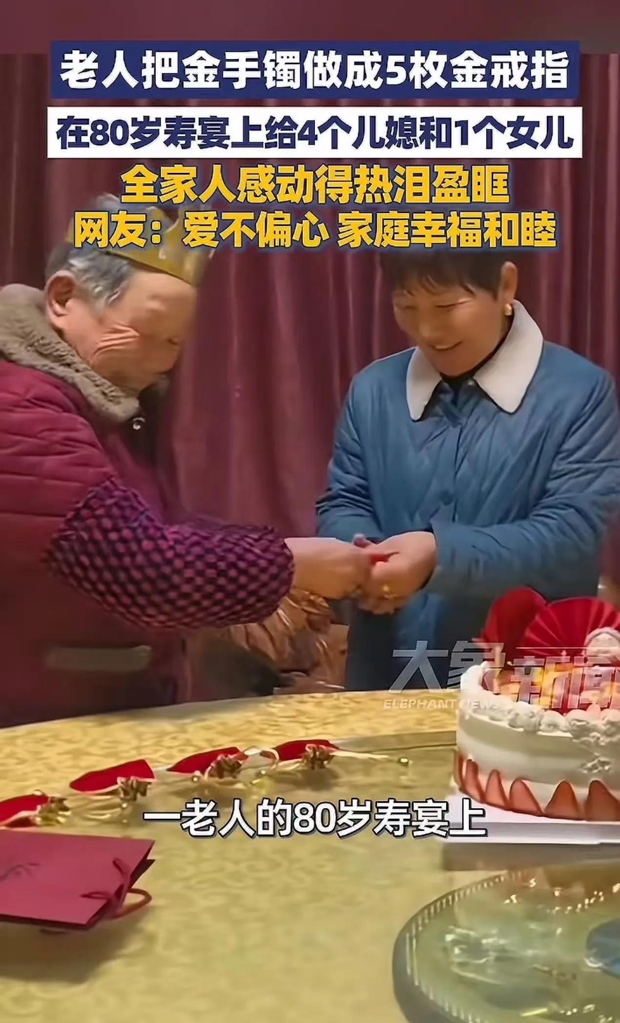 2月18日,安徽安庆,一场80岁寿宴上,老人把自己那只金手镯拿去改制,做成5枚金戒指,当场送给4个儿媳和1个女儿,这段视频很快就在网上传开了。 寿宴是家里人都到齐的场合,桌上坐的都是最亲近的人,镜头对着老人和几个晚辈,礼物一拿出来,现场就停了一下。 孙女齐女士后来对外说,当时全家都很感动,拍摄的时候大家都热泪盈眶,戴上戒指那一刻,气氛一下子就变了。 关键点也很清楚:不是新买的,是把手上的旧手镯拆开重做,一镯变五戒,五个人一人一枚,名单也直接摆出来了。 4个儿媳都有,女儿也有,这个分法比金子更容易引发讨论。 因为它不是“给礼物”这么简单,它像是在家庭里做了一次公开确认:儿媳在不在这个家的圈里,女儿远不远、算不算数,老人用一枚戒指把话先说在前面了。 评论区里常见的说法大概分几路。 一类人盯着“公开+平均”,意思是少留口子,谁也别猜,尤其是儿媳这种身份最容易被忽略,给到位就少了很多暗账。 一类人盯着“平均未必公平”,家里谁照护多、谁跑腿多、谁陪诊多,现实里差别很大,礼物平均发出去,短期能压住火,后面可能会冒出另一句:既然都一样,那以后也别指望我多做。 还有一类人盯着“女儿那枚戒指”,不少家庭的女儿嫁出去以后,逢年过节回家像客人,老人这一下把女儿摆到同一张名单里,等于把“你还是自家人”落成了一个实物。 也有人把注意力放在“寿宴这个时间点”上。 很多矛盾不是因为东西多贵,是因为给得不明不白:私下塞给谁、谁先拿到、谁后知道,最后变成传话、猜话、翻旧账。寿宴当众给出去,至少把“谁拿了什么”变成公开事实,后面少掉一半口水。 但公开也会带来另一种现实:拿到的人会被默认“更该出力”。 儿媳戴上戒指,家里人很容易顺势形成一个默认安排:老人以后有事,你也在责任名单里。女儿戴上戒指,也会影响她在家里讨论大事时的位置,有没有份额是一回事,有没有话语权又是另一回事。 这事能上热搜,核心其实就两点:分配对象清楚,分配方式清楚。 很多家庭缺的不是一只镯子,缺的是这种清楚。 清楚能减轻猜疑,也会把一些责任提前摊开,往后是更省心还是更别扭,就看一家人有没有把照护、花销、安排这些事也说到明面上,不然戒指只是把矛盾往后挪了一段路。