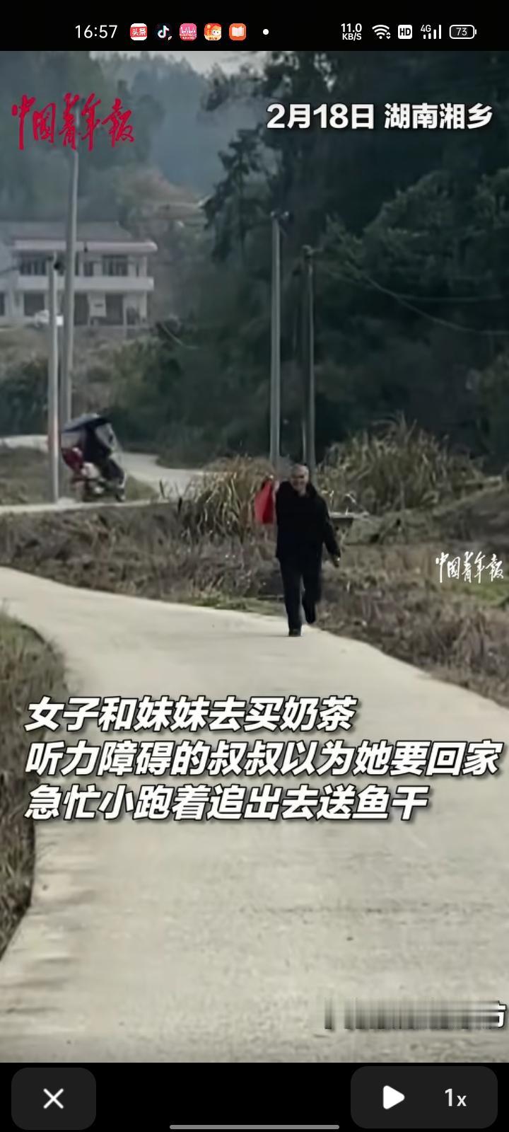 2月19日,湘潭湘乡市。女子发视频表示,自己跟妹妹去买奶茶,听力障碍的叔叔以为她们要回家,急忙小跑追出去送小鱼干。 当事人刘女士称,看了之后就觉得哽咽了。从小他就知道她喜欢吃腊肉、鱼干和鸡,他人挺好。她小时候他就去捡废品,不管别人给他的钱和打零工赚的钱,都会给她当做零花钱