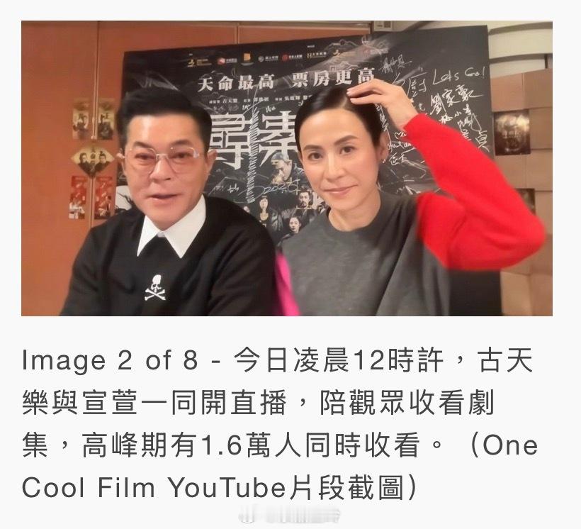 古天樂、林峯、宣萱、郭羡妮及滕麗名領銜主演的電影《尋秦記》,截至昨天(18日)的港澳累積票房收93,001,675港元,衝破9300萬。電影近日推出加長版「Plus+多元宇宙版」,電視台亦於年初一午夜起重播劇集,令「尋秦」熱潮持續升溫。今日凌晨12時許,古天樂與宣萱一同開直播,陪觀眾收看劇集,高峰期有1.6萬人同時收看。2人在直播期間不時古靈精怪,頻頻搞笑互動,古天樂多次做出雙手托頭的嬌俏動作,又故意向宣萱做出嗝氣動作,場面溫馨又不乏笑料。