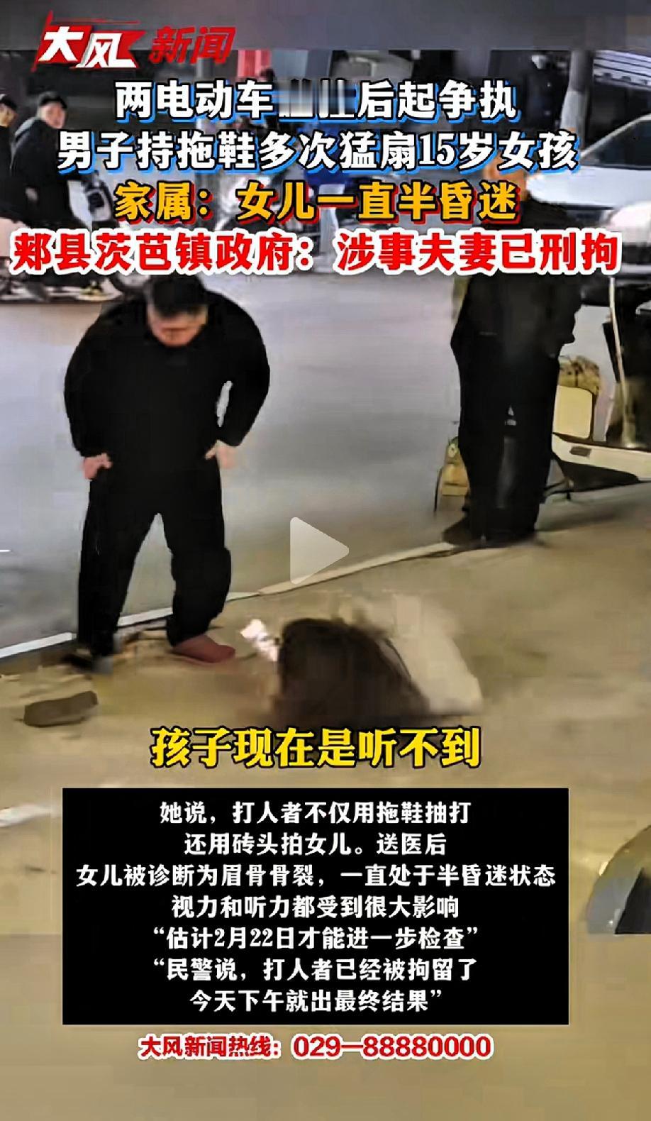 俩电动车碰撞后起争执,男子持拖鞋和板砖多次猛扇15岁女孩。 家属:女儿一直昏迷。视力和听力都收到损伤。 2026年2月20日,平顶山郏县茨芭镇街头发生的事儿,真让人惊掉下巴。 15岁少女骑电动车和老人剐蹭,这本来小事一桩,好好沟通就能解决。少女主动停车想化解矛盾,却遭老人辱骂,辩解几句就惹祸上身。 老人喊来儿子儿媳,那男的直接捡砖头砸少女头部,接着又用拖鞋猛扇。旁边还有黑衣女子踢踹,女孩眉骨骨断,连拉架的女子都被掌掴。情景恶劣,连拉架的都打。 有人说孩子辱骂老人,可女孩家属称是老人骂人,女孩还嘴才被打。 关于此次事件的过程无论谁先开口辱骂,都不该这样欺负一个15岁的女孩。犯法了有法律管,女儿如果先开口由其父母管教。老人的儿子儿媳不该大庭广众之下暴打一个未成年人。 消消气!本来是一件小事情非要动手打人,尤其对方还是一个未成年的小姑娘,打人的夫妻是怎么下去手的。典型的持强凌弱,欺负小姑娘。 这事儿必须有个公正结果,不能让暴行就这么算了,希望尽快查明真相,给女孩一个公道。