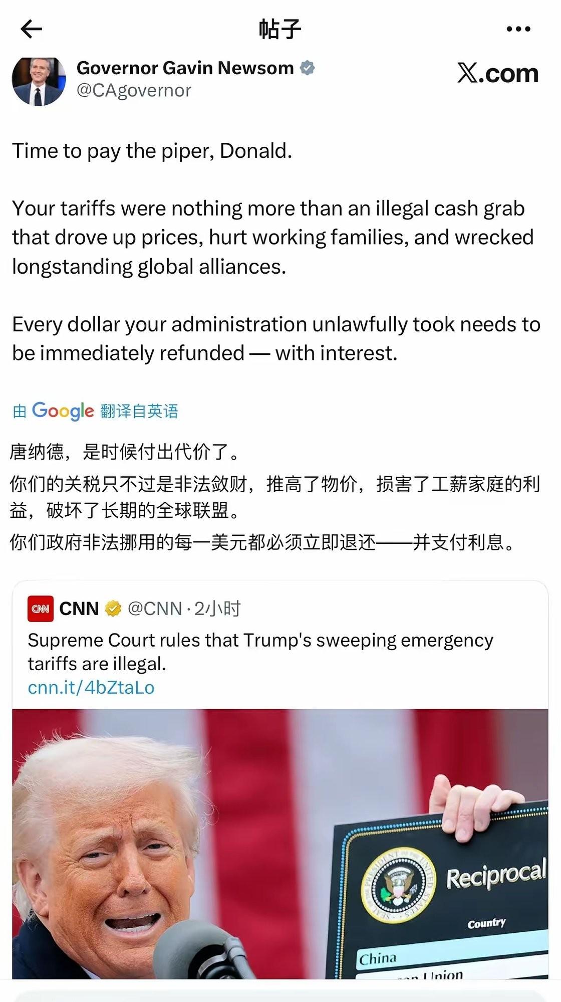 加州州长纽森表示:“特朗普非法征收食品杂货、家具和汽车关税,至今已超过一年。现在