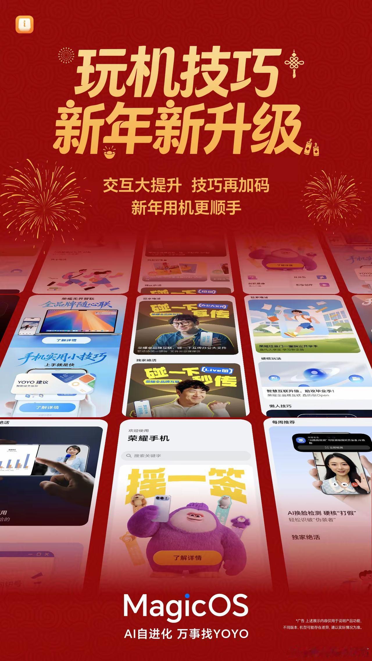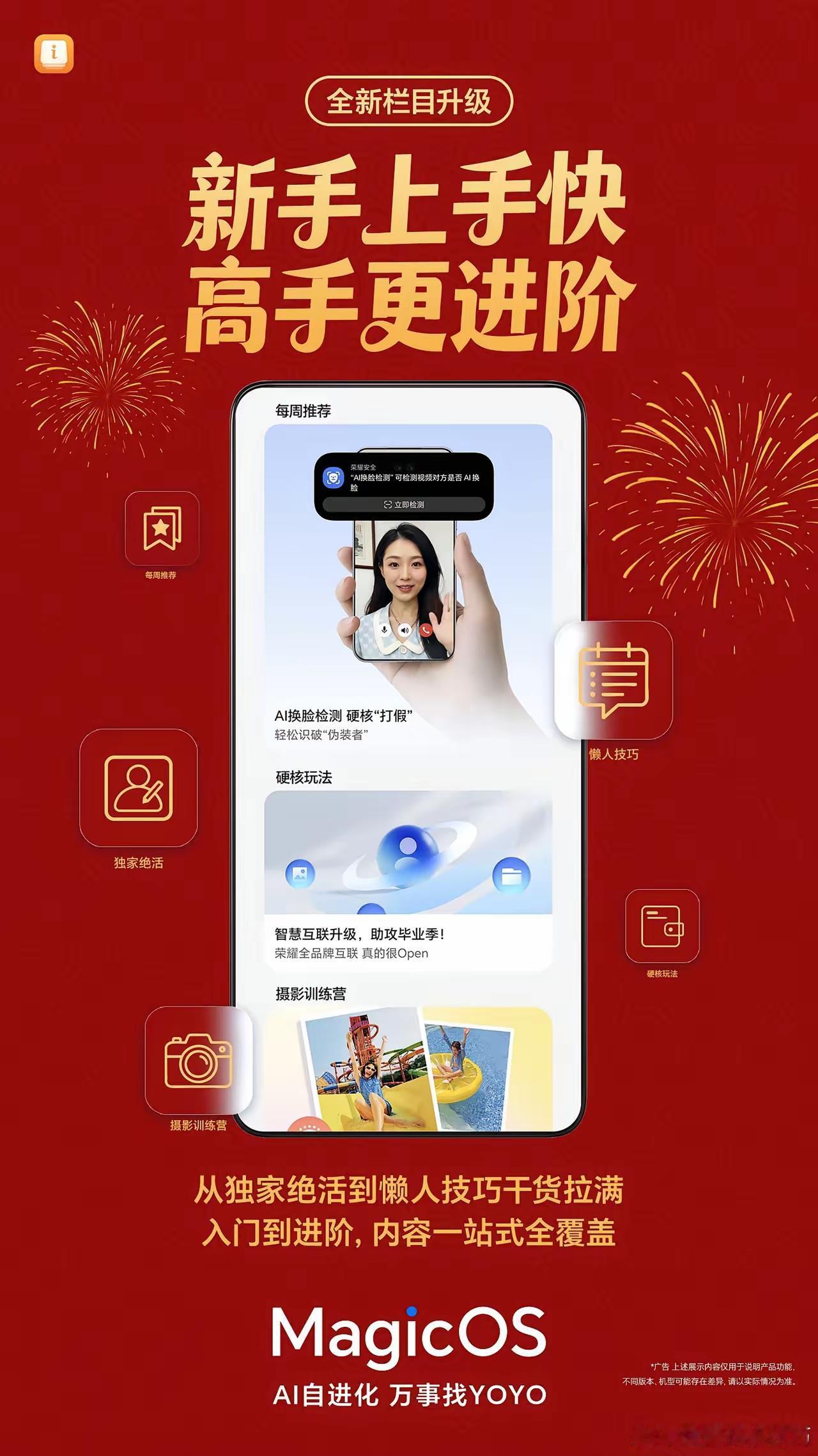 这决策真tm绝了,荣耀是真够意思! 我真的会谢!要不是过年闲着无聊瞎点,都不知道自己的荣耀手机这么香!MagicOS 10这系统,平时就刷刷视频回回消息,感觉也就那样。结果今天手滑点进那个叫“玩机技巧”的App,好家伙,直接给我整破防了。 一打开,嚯!这界面大变样了,丝滑得就像德芙成精,刷起来贼跟手,页面也养眼不少。以前觉得这App就是个说明书,谁没事看这个?但现在不一样了,内容直接一滑到底,想找啥功能直接搜,效率拉满。 最骚的是啥?它能边刷边学了!比如我平时刷短视频,刷着刷着它就蹦出个教程,教我怎么用AI一键去照片路人,怎么用智慧识屏快速提取文字。我刚看完,手痒想试一下,嘿,它直接引导我开练。真的,那种“一看就会,一用就对”的爽感,谁懂啊?MagicOS 10这波AI,属实是玩明白了。 如果你也是个刚入坑荣耀的新手,或者用了好久感觉还是只会基础操作的老司机,真心建议你去翻翻这个App。从入门到进阶,可能你花几分钟看个技巧,以后每天用手机的效率就能起飞。 赶紧的,趁新年,去把你手机里这个宝藏App翻出来,别让它吃灰了!
