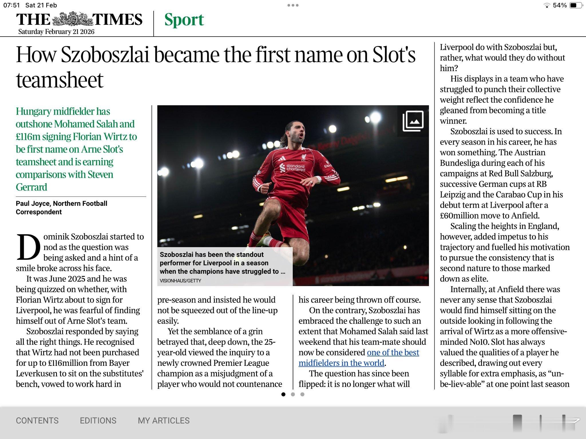 泰晤士报记者乔伊斯透露索博和萨拉赫经常一起加练任意球。并且索博影响力逐年递增。