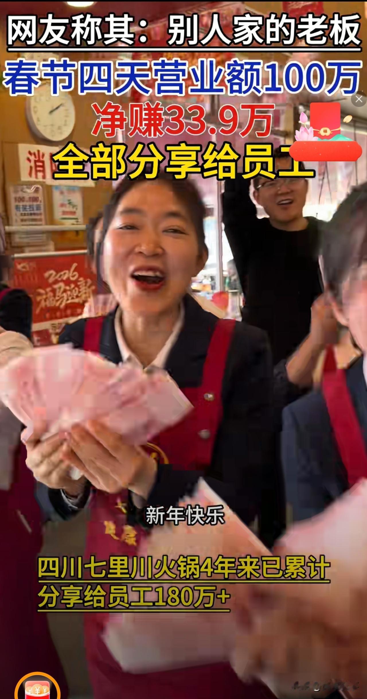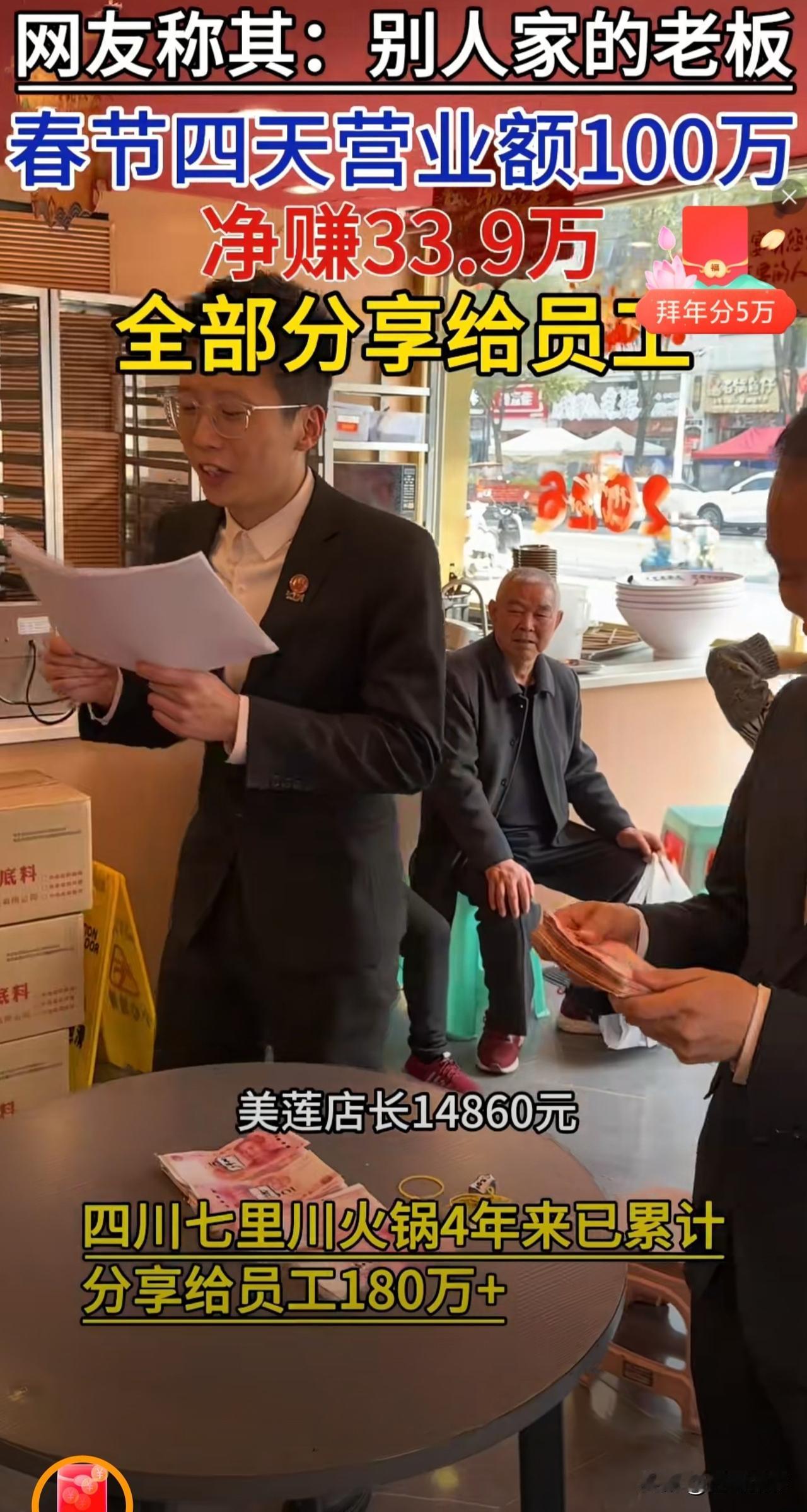 “这样的老板,活该赚钱!”四川,一火锅店老板火了:过年期间,4天经营的利润合计339000元全部分给了员工,老板一坚持就是4年。网友:“老板格局大,有财大家发,了不起!” 大年初四,四川遂宁的一家火锅店里暖意融融,老板黄厚明将春节前四天的33.9万元利润,一分不留全部分给在岗员工。 其中,店长领到14860元,服务员最高拿到4865元,就连保洁阿姨也分到1447元。真金白银摆在桌上,没有套路、没有门槛,让在场所有人红了眼眶。 这不是偶然的慷慨,而是黄厚明坚持了四年的承诺。 从2023年春节开始,他便将除夕至初二的盈利全数分给员工,今年更是把分红天数增加到四天,用最实在的方式,回馈每一位坚守岗位的家人。 春节的火锅店,有多忙只有餐饮人知道。 别人阖家团圆吃年夜饭,他们在油烟里来回跑;别人走亲访友拜年,他们从早站到晚,脚站肿了、嗓子喊哑了,都是常态。 很多人因为工作,没法回家陪父母、陪孩子,心里满是亏欠。 可在这家店里,他们的付出,被老板清清楚楚看在眼里并记在了心里。 分红现场,气氛异常热烈: 平日里一向沉稳的店长,拿到14860元分红时,难掩内心的激动。 春节期间,火锅店连轴运转,她全程守在店里统筹协调,这份沉甸甸的回报,既是对她辛苦付出的肯定,也让她真切感受到了被信任、被重视的踏实。 拿到最高4865元分红的服务员,同样心里满是温暖。春节四天正是客流高峰,她们放弃了与家人团圆的机会,在岗位上忙前忙后,而这份实实在在的收益,就是对他们努力最好的回馈。 就连保洁岗位的员工,也顺利领到了1447元分红。 要知道,在很多场所,保洁岗位常常容易被忽略,但在这家火锅店,每一个岗位、每一份劳动都被平等看待,哪怕是最基础的工作,也能得到应有的尊重与回报。 这件事也迅速冲上热搜,戳中了无数打工人的心。 网友们纷纷留言:“这才是真正的老板,把员工当家人” “我们春节加班连三倍工资都没有,差距太大了” “不是钱多钱少,是这份心意太难得。不画饼、只给钱,这样的老板太少了。” 当然,也有理性网友表示,不是所有企业都能如此分红,但尊重与公平,本该是职场的底线。 这件事之所以让人破防,从来不是因为金额数字,而是它满足了打工人最朴素的期待:付出就有回报,辛苦能被看见,劳动可被尊重。 在这个充满功利与算计的时代,这份真诚与慷慨,显得格外珍贵。 黄厚明用行动证明,最好的管理从不是压榨与画饼,而是真心换真心。 他把火锅店变成了一个温暖的大家庭,让每一个努力生活的人,都能收获实实在在的温暖与尊严。 最后,也想问大家一句:你遇到过这么暖心的老板吗?春节坚守岗位的你,又拿到了什么样的回报呢? 欢迎大家在评论区留言。
