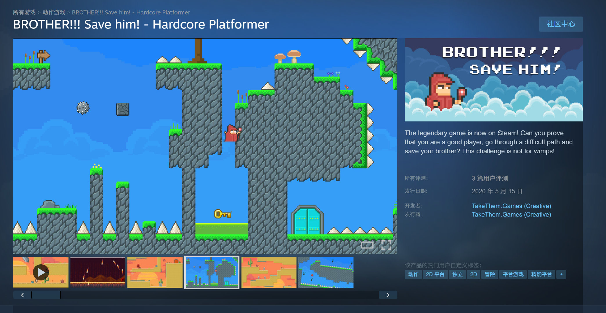 《BROTHER!!!Save him!》这是一款复古风格(像素)的硬核2D平台跳跃游戏。你将扮演魔法师本,你的兄弟贾尔被邪恶入侵,闯过艰难险途,救出你的兄弟。
